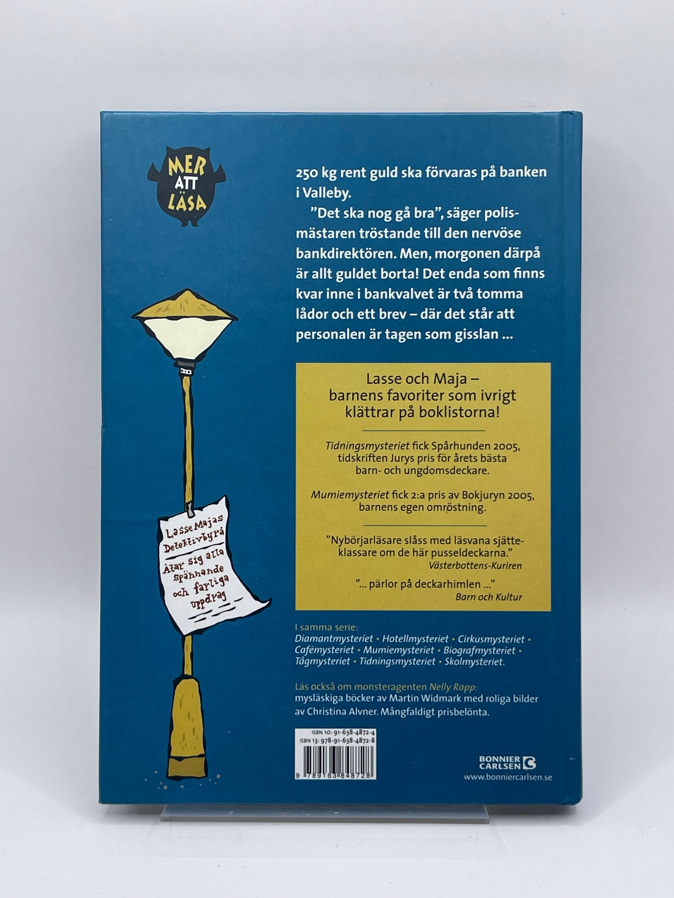 "Guldmysteriet" är en del av den mycket älskade bokserien LasseMajas Detektivbyrå, skriven av Martin Widmark och illustrerad av Helena Willis. Boken bjuder på en fängslande berättelse där Lasse och Maja löser mysterier i den lilla staden Valleby. Perfekt för unga läsare som älskar spänning och äventyr. Denna bok är begagnad men fortfarande i mycket gott skick, vilket gör den till ett utmärkt tillägg i varje barns boksamling.