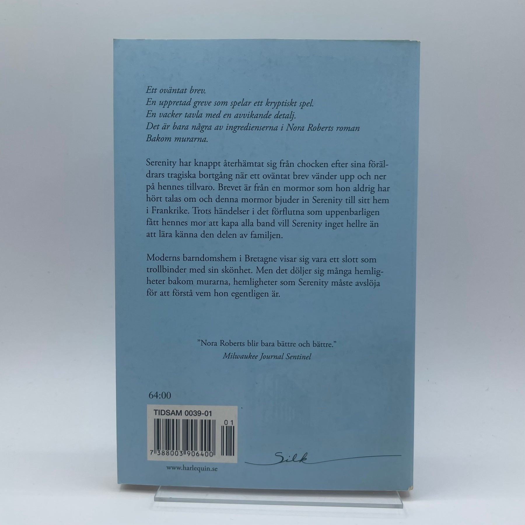 "Bakom murarna" är en fascinerande roman av den berömda författaren Nora Roberts. Boken skildrar en berättelse full av hemligheter och gåtor, belägen i det pittoreska Bretagne. Perfekt för läsare som älskar intriger och starka, emotionella berättelser. Boken är begagnad men i mycket gott skick, sidorna är väl bevarade utan markeringar eller skador.Produktspecifikationer