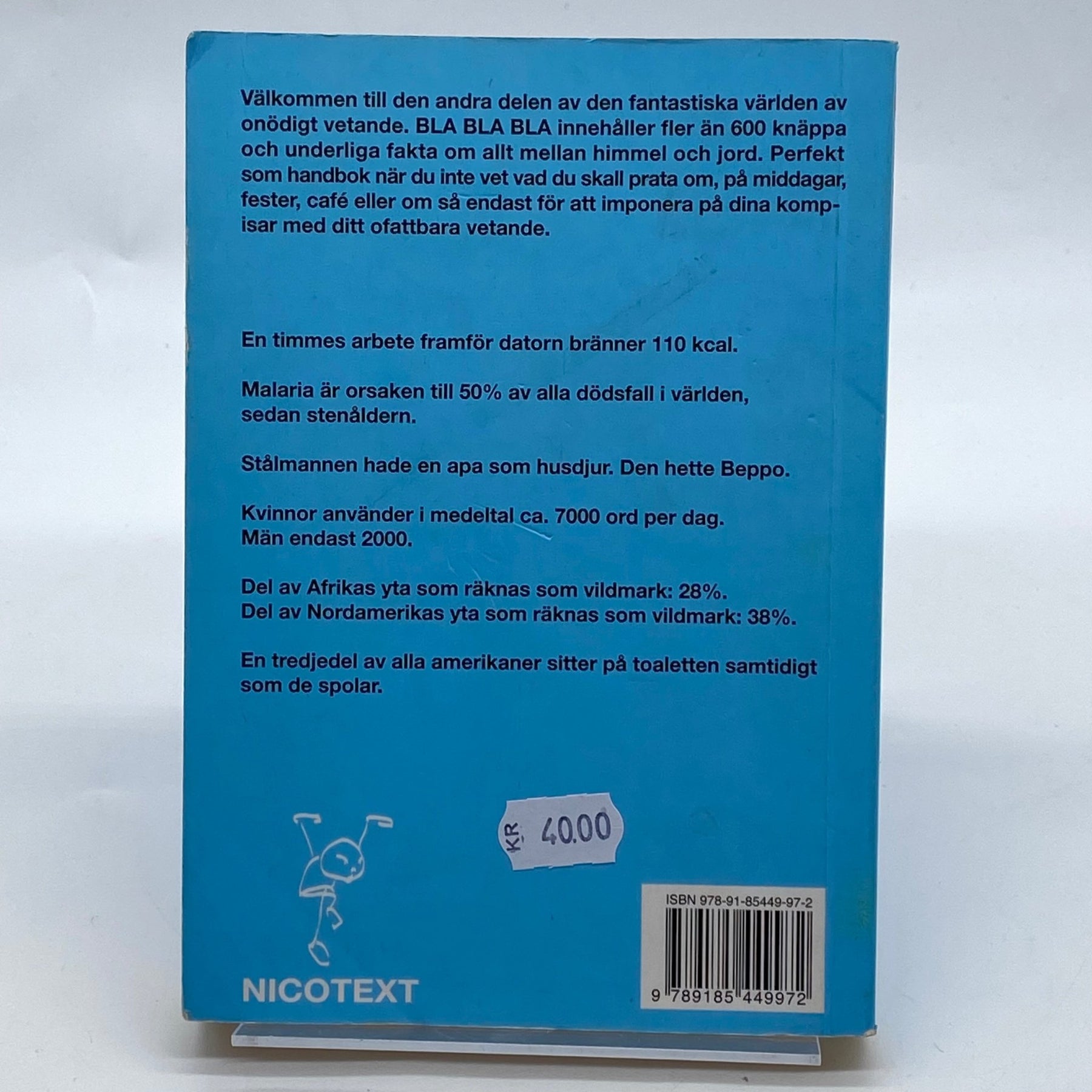 "BLA BLA BLA" erbjuder en skattkista av roliga och ibland absurda fakta perfekt för alla sammanhang. Denna fängslande läsning från Nicotext är idealisk för festspel eller som konversationsstartare. Boken är begagnad men är i mycket gott skick, vilket gör den till ett utmärkt köp för bokälskare.3. Produktspecifikationer