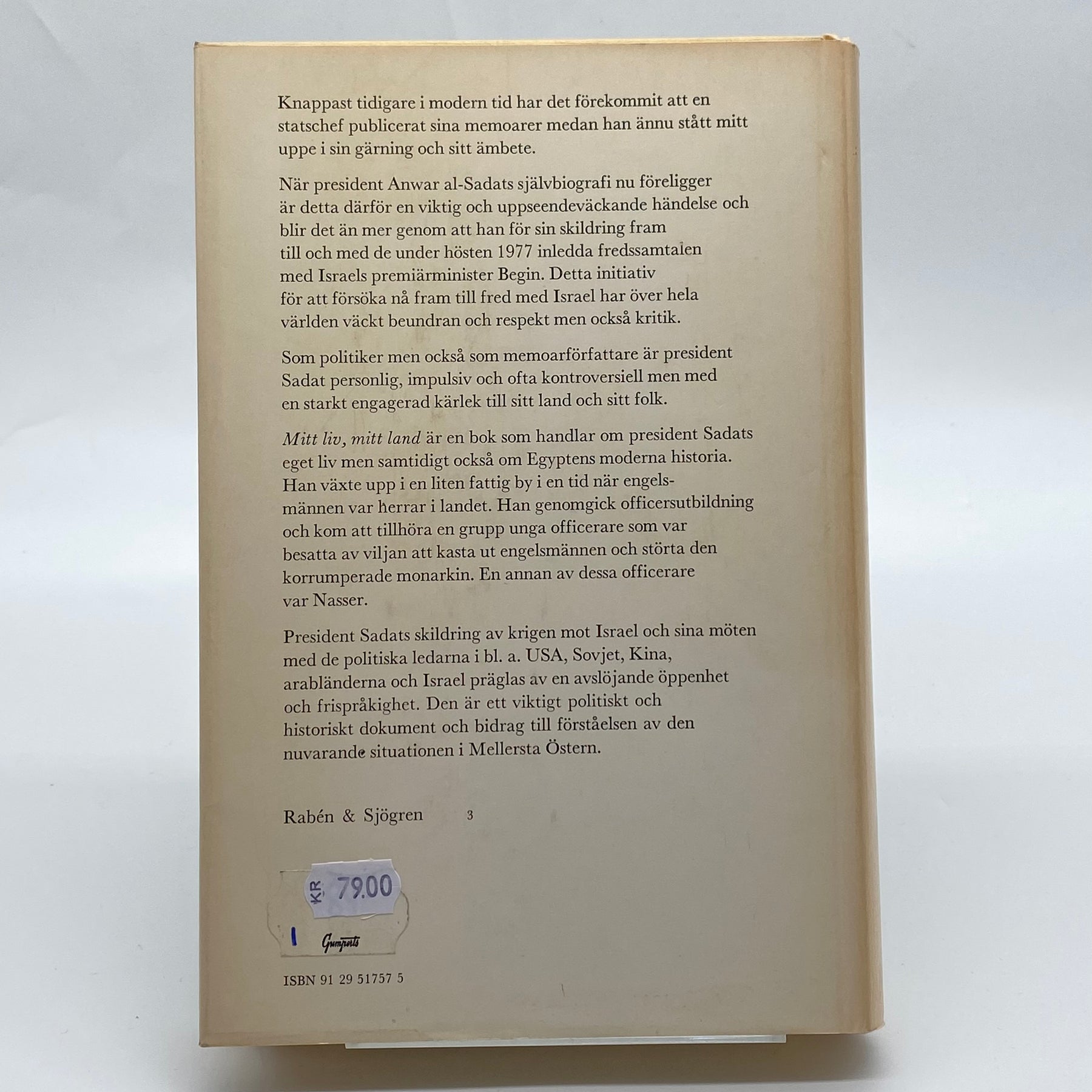 "Mitt liv, mitt land" är inte bara en bok; det är en djup personlig berättelse av Egyptens före detta president, Anwar el-Sadat, som speglar både den politiska och personliga resan genom hans liv. Boken erbjuder en unik inblick i viktiga historiska händelser och Sadats egen syn på ledarskap och internationella relationer. Den är skriven med en öppen och inbjudande stil, och dess skick tyder på att den har bevarats väl genom åren – en verklig skatt för samlare av politisk litteratur.3. Produktspecifikationer