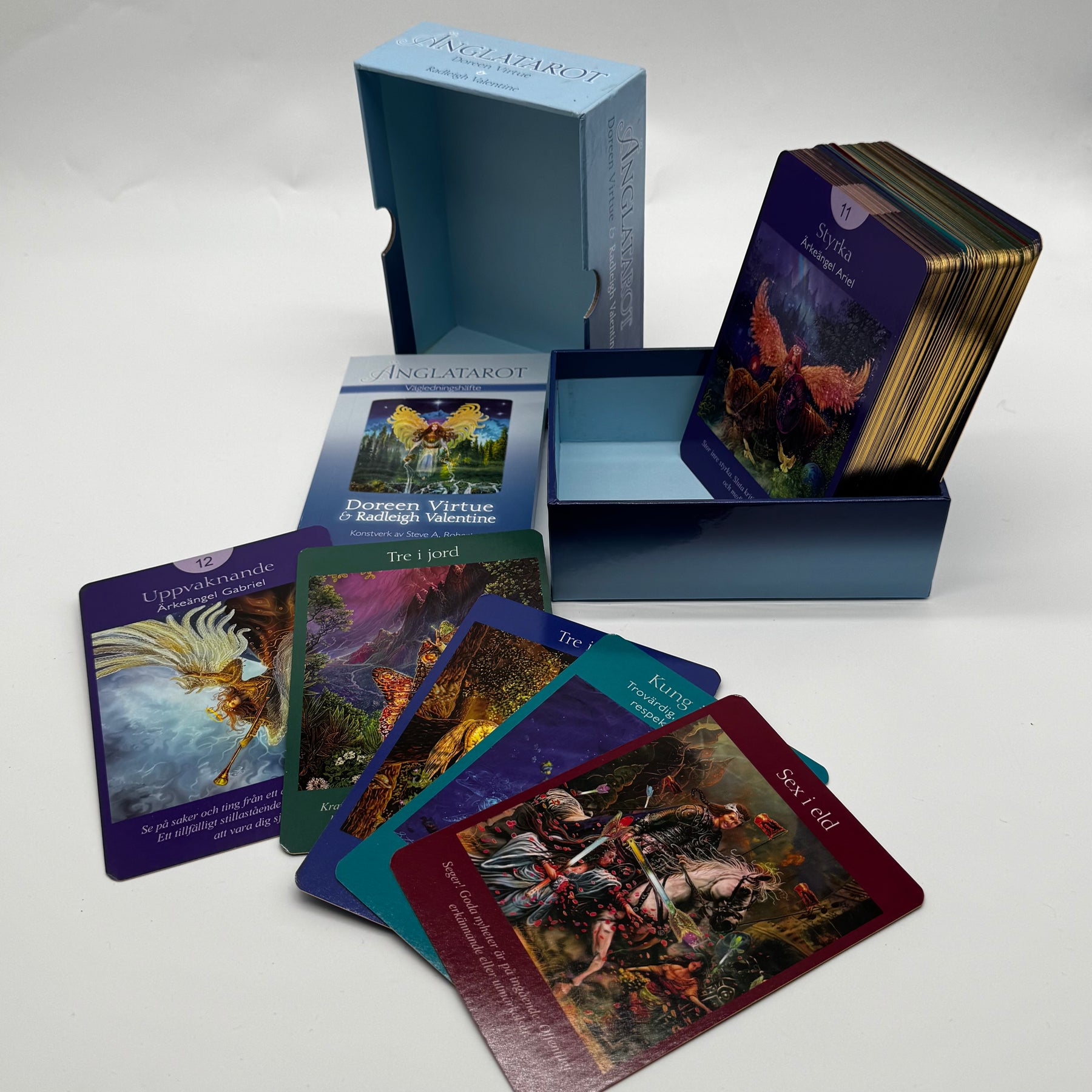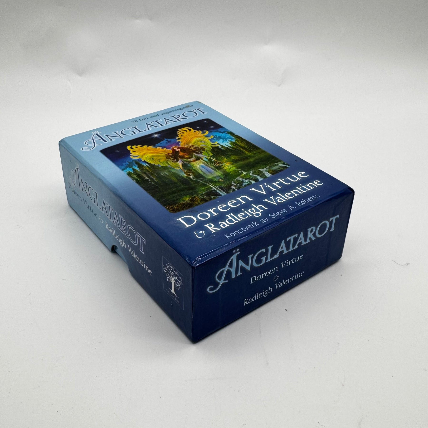 Änglatarotkorten är skapade av Doreen Virtue och Radleigh Valentine och presenterar en mjukare tolkning av traditionella tarotteman. Dessa kort är perfekta för både nybörjare och erfarna tarotläsare som söker positiva budskap och klar vägledning i sina läggningar. Korten är noggrant illustrerade av Steve A. Roberts, vilket tillför en visuell rikedom till varje dragning. Setet är begagnat men i mycket gott skick och komplett med alla 78 kort samt en guidebok.