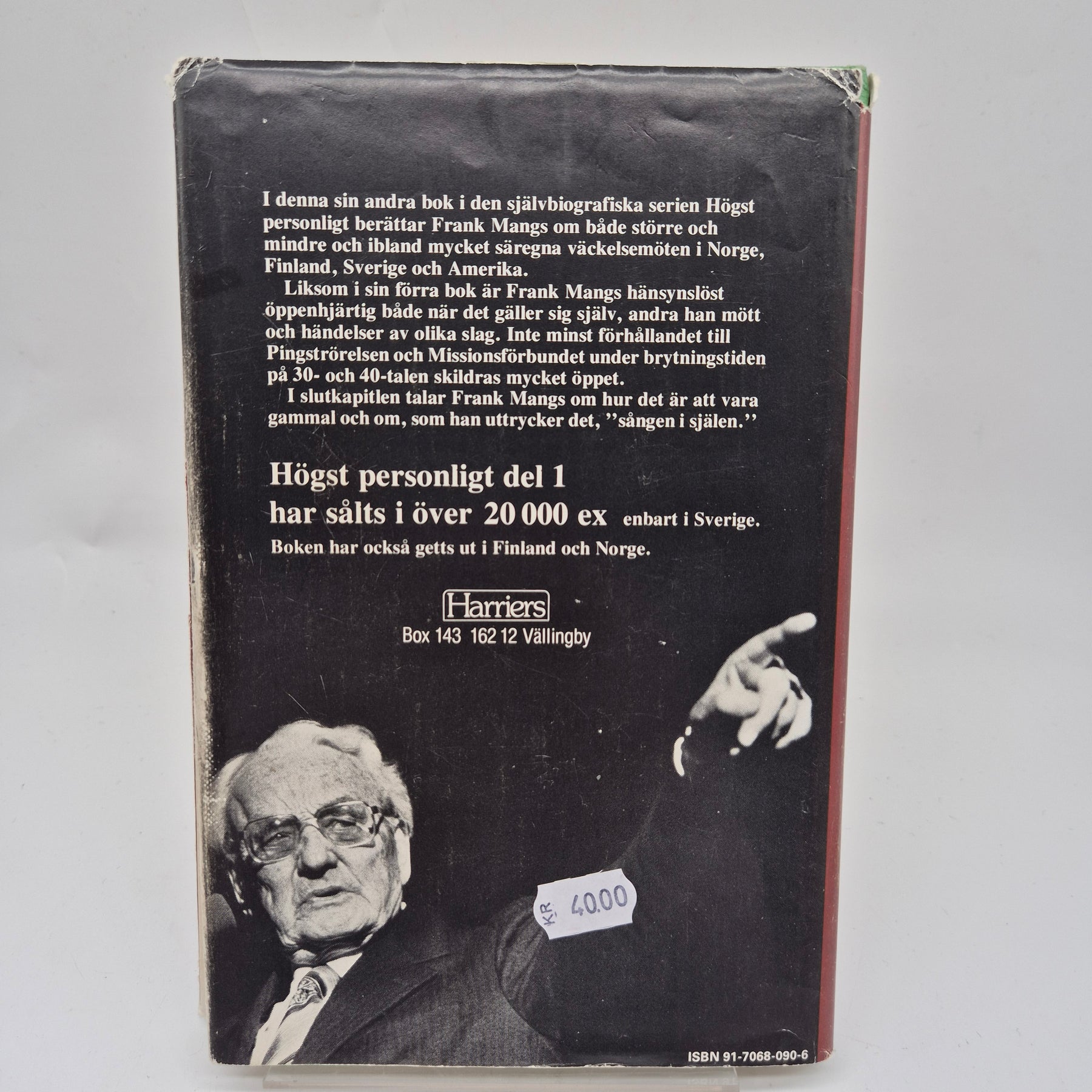 Denna biografi om Frank Mangs, "Högst Personligt Del 2", ger en gripande och personlig redogörelse av hans liv och arbete i Norden och Amerika. Utgiven av Harriers, denna volym är del två i en serie som skildrar viktiga händelser och personliga erfarenheter av denna älskade predikant. Boken är ett måste för läsare som uppskattar historiska och djupgående berättelser. Begagnad men i gott skick.Produktspecifikationer