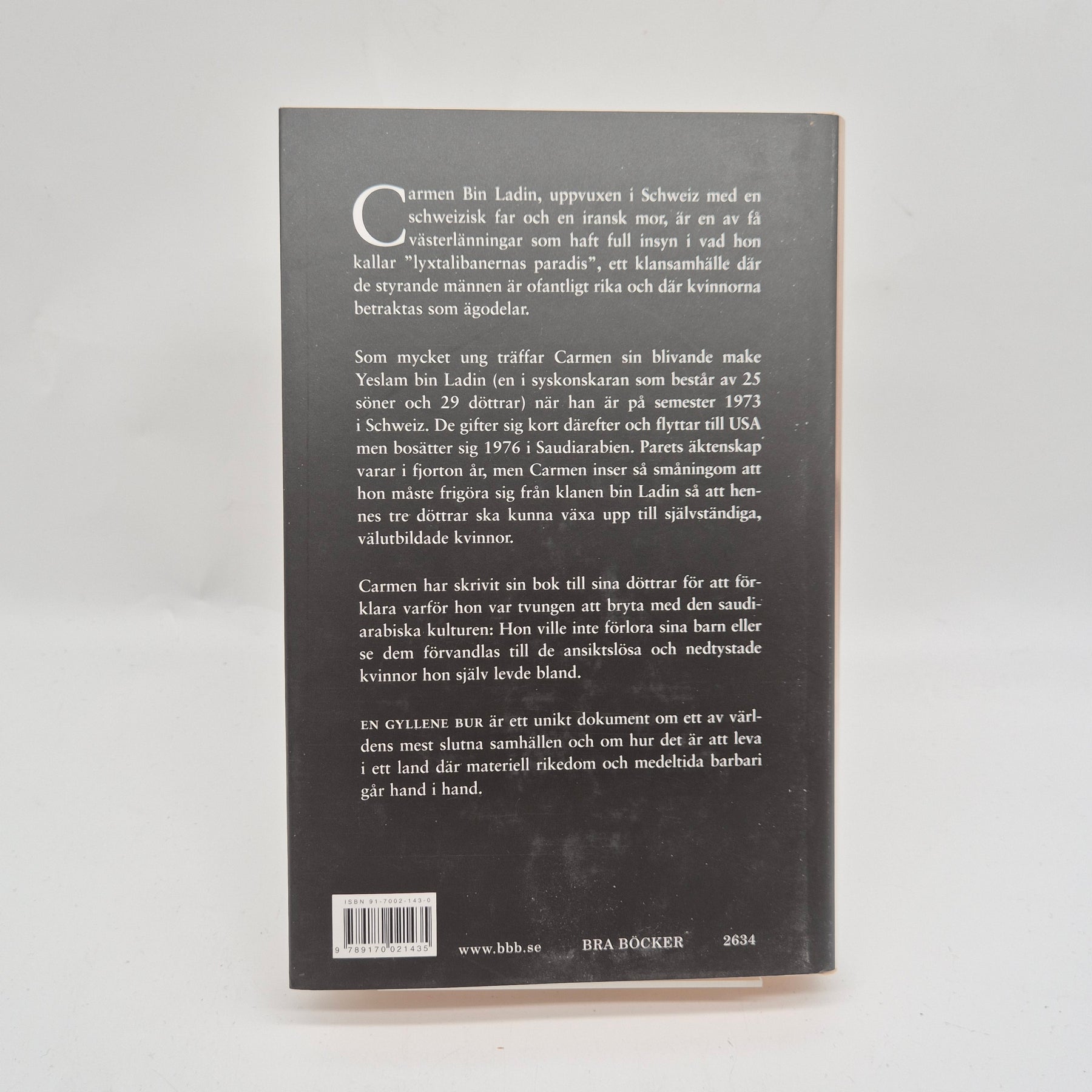 "En gyllene bur" är en biografi som erbjuder en unik inblick i författaren Carmen Bin Ladins liv och hennes erfarenheter inom en av de mäktigaste familjerna i Saudiarabien. Boken belyser kulturella skillnader och personliga utmaningar med en djup mänsklig touch. Perfekt för alla som är intresserade av biografier och personliga berättelser från verkliga livet. Boken är begagnad men i mycket gott skick.