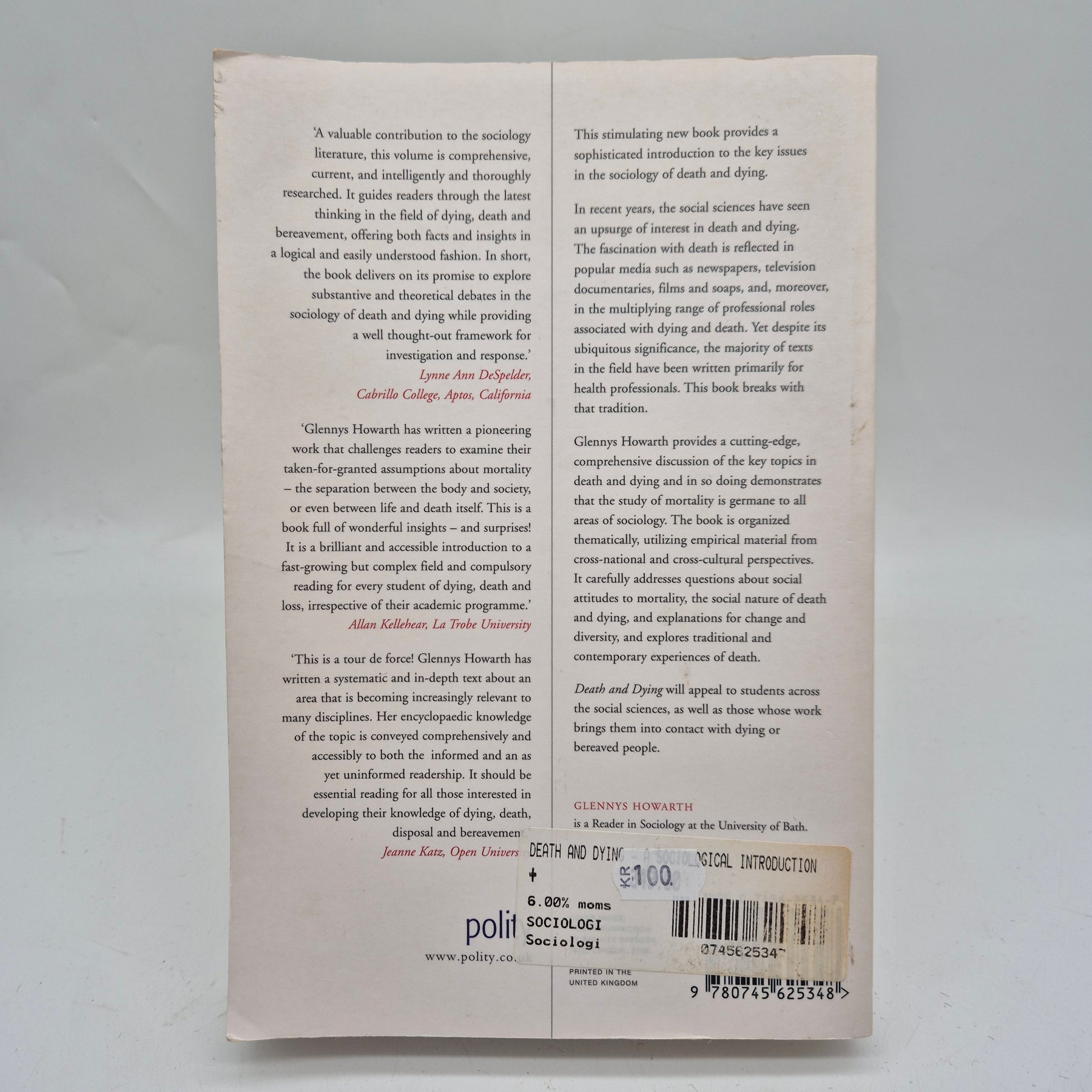 "Death & Dying: A Sociological Introduction" är en viktig resurs som täcker sociologiska aspekter kring döden. Denna bok av Glennys Howarth erbjuder nya perspektiv och är fylld med empiriska data och teoretiska insikter om ämnets sociala och kulturella dimensioner. Perfekt för de som studerar sociologi, vården eller är allmänt intresserade av samhällsvetenskapliga frågor. Boken är begagnad men i mycket gott skick, vilket gör den till ett utmärkt köp för både personligt bruk och bibliotekssamlingar.| Kategori | Bok |