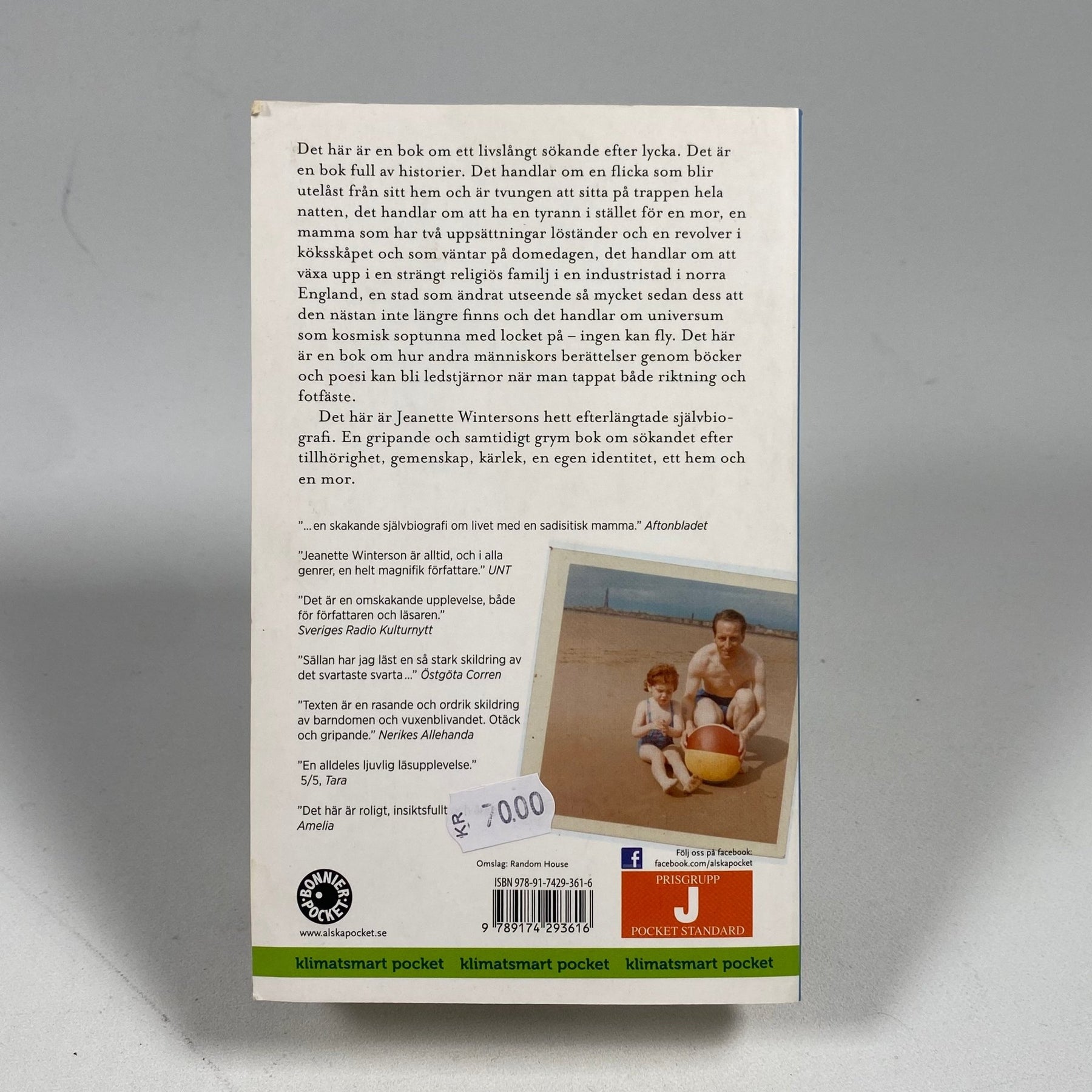 En välanvänd pocketbok av Jeanette Winterson. Boken är en biografisk roman som utforskar teman av sökande, identitet och försoning. Den är på svenska, i gott skick med viss yttre slitage men välbevarad inlaga.