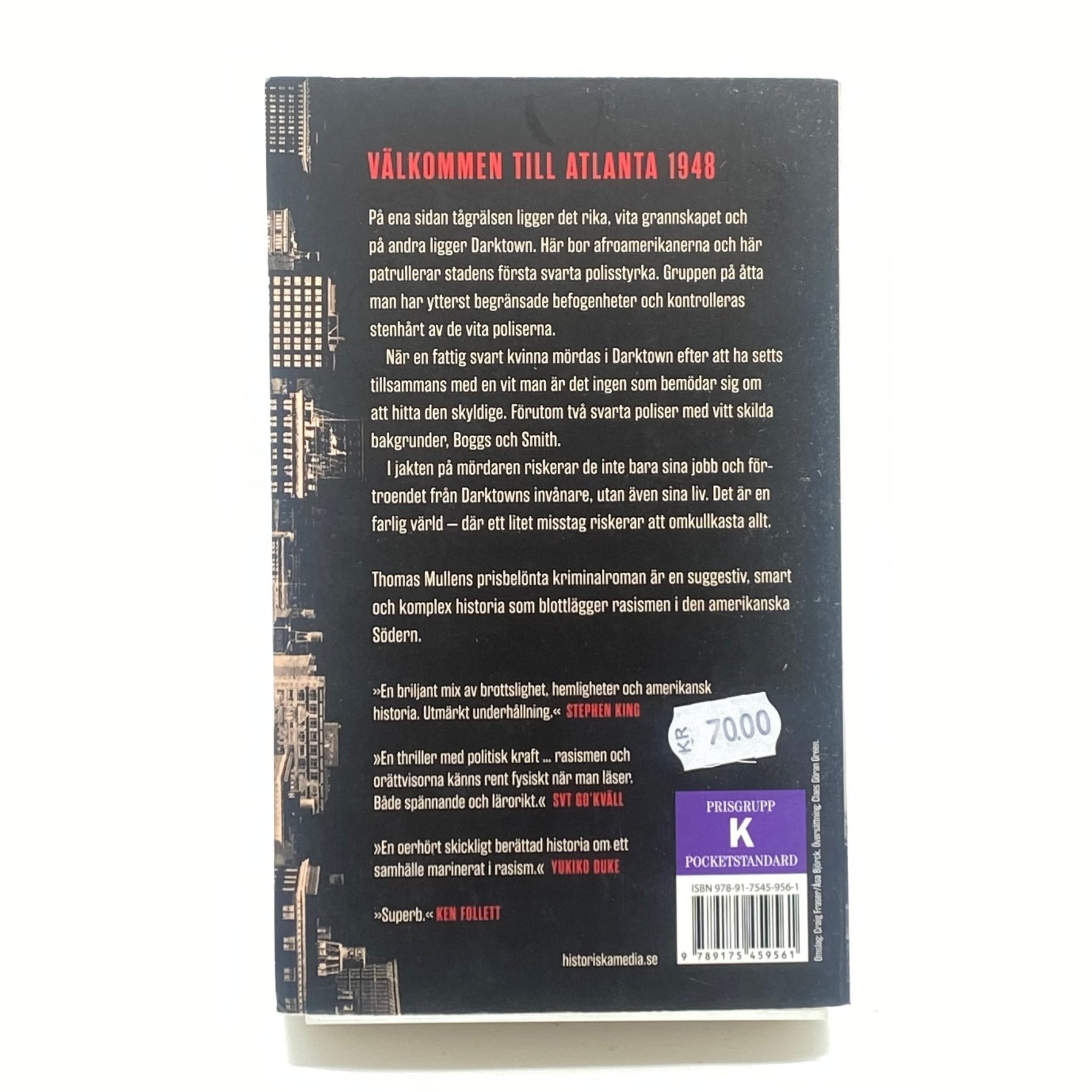 "Darktown" av Thomas Mullen är en kriminalroman som utspelar sig i Atlanta 1948, där rasismens mörka realiteter kommer till ytan. Boken skildrar en tid då brottsligheten inte bara är svart eller vit. Den är perfekt för de som uppskattar djup historisk kontext kombinerad med spännande berättande. Begagnad men i utmärkt skick.3. Produktspecifikationer