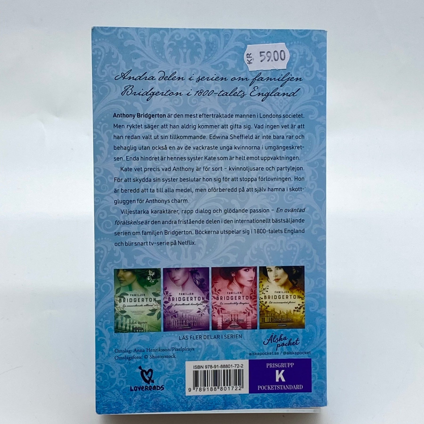Denna del av serien Familjen Bridgerton tar dig tillbaka till det romantiska 1800-talets England där kärleken och dramat aldrig är långt borta. Boken är perfekt för de som älskar historiska romaner med en touch av samtida populärkultur, då serien även finns tillgänglig som en framgångsrik Netflix-serie. Boken är begagnad men i mycket gott skick, vilket gör den till ett utmärkt köp för såväl samlare som romantikläsare.3. Produktspecifikationer