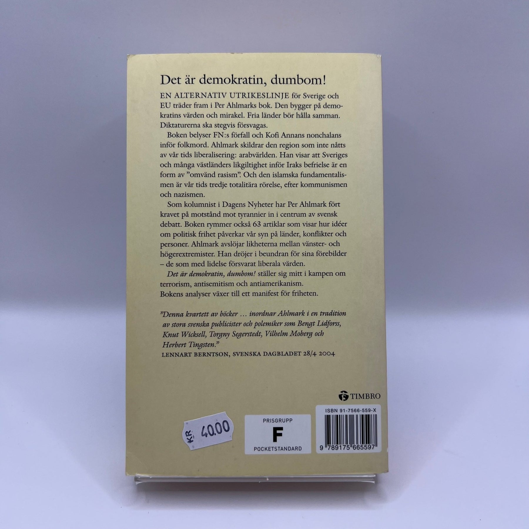 Begagnad bok som diskuterar demokratiska frågor och politik i Sverige, skriven av Per Ahlmark. Titeln reflekterar författarens direkta och engagerade stil. Boken innehåller essäer och artiklar om politik och mänskliga rättigheter och är i gott skick.