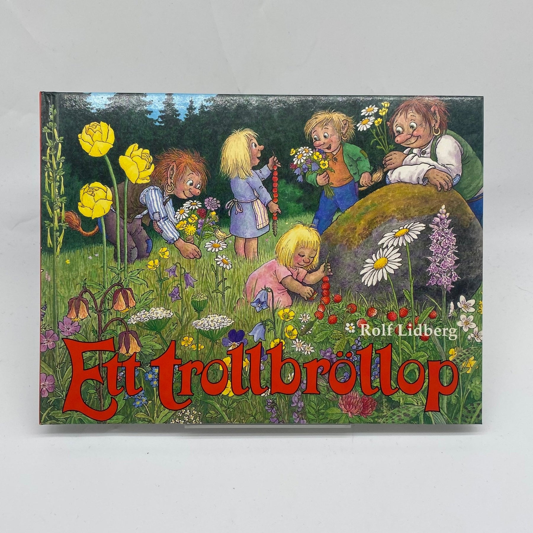 Barnbok med titeln "Ett trollbröllop" av Rolf Lidberg, innehållande charmiga illustrationer av troll i olika vardagliga och fantasifulla miljöer. Boken är i gott skick och lämpar sig för uppläsning för barn.