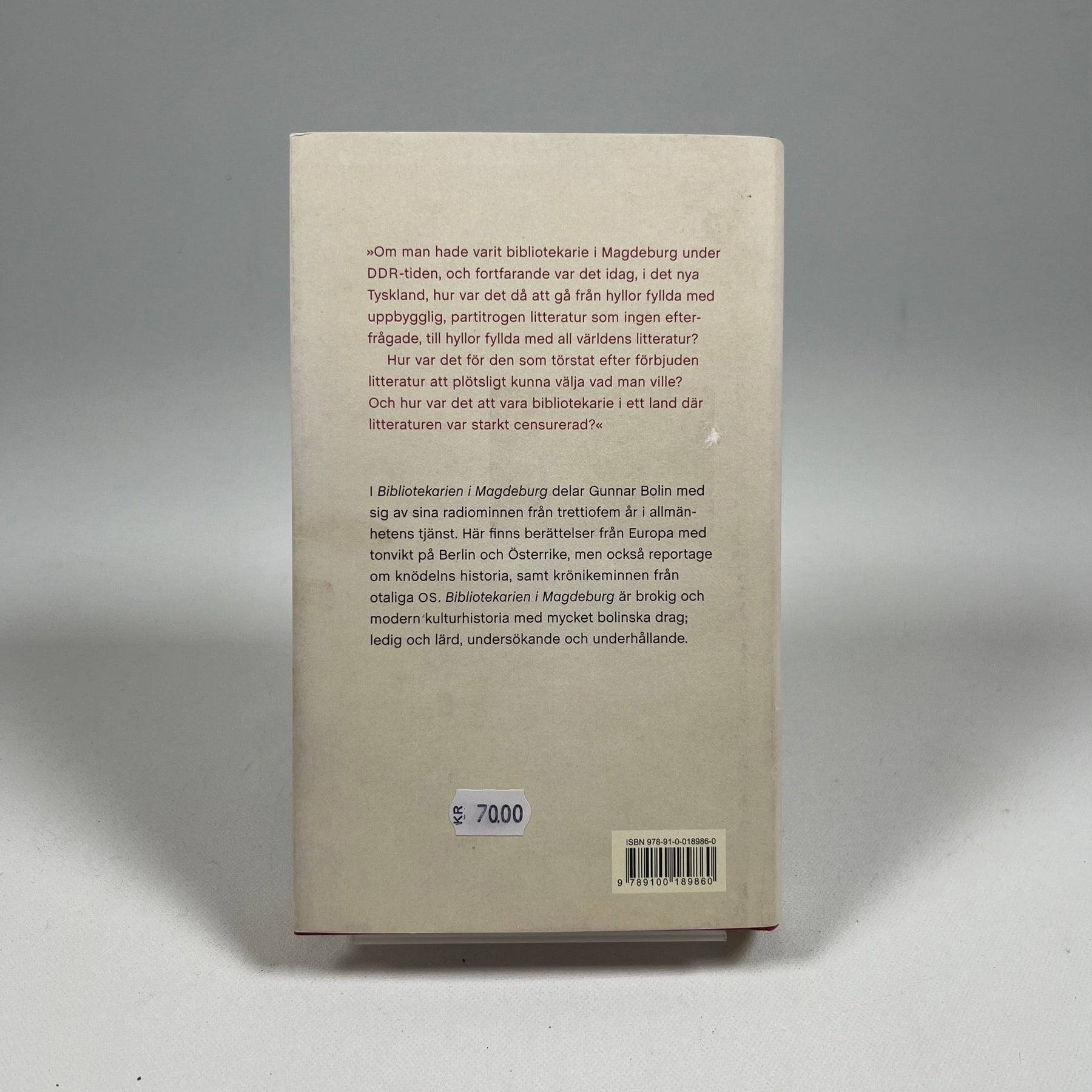 Bok i pocketformat. "Bibliotekarien i Magdeburg" av Gunnar Bolin innehåller berättelser och reflektioner kring radio och litteratur, inspirerade av författarens liv och erfarenheter. Boken är använd men i gott skick.