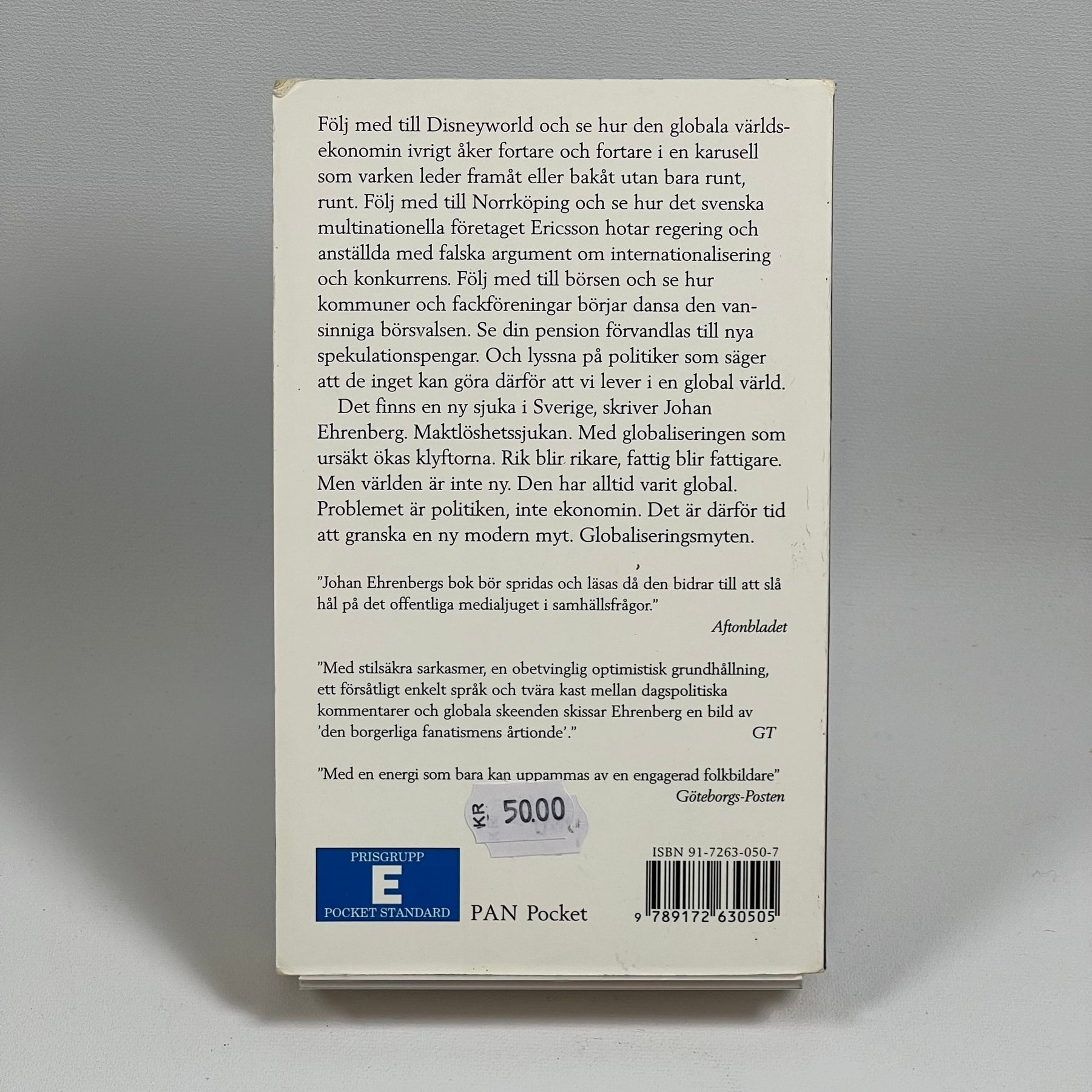Bok i pocketformat som utforskar de ekonomiska och sociala effekterna av globalisering. Skriven av Johan Ehrenberg, ger den ett kritiskt perspektiv på hur globala ekonomiska strukturer påverkar politik och samhällen. Boken är använd men i gott skick.