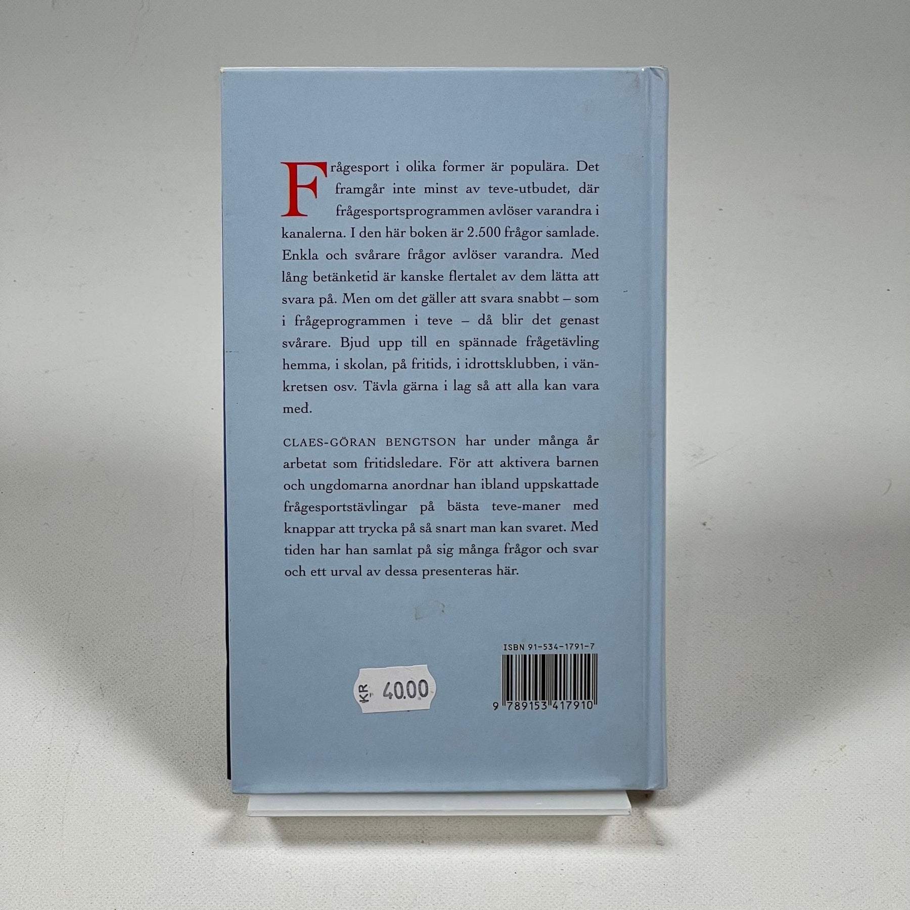 Boken "Frågesport för stora och små" är en underhållande samling av över 2500 frågor som passar för olika åldrar och sammanhang, från hemmet till skolan. Den är idealisk för att aktivera sällskapsspel och lärande stunder. Boken är begagnad men i gott skick.Produktspecifikationer