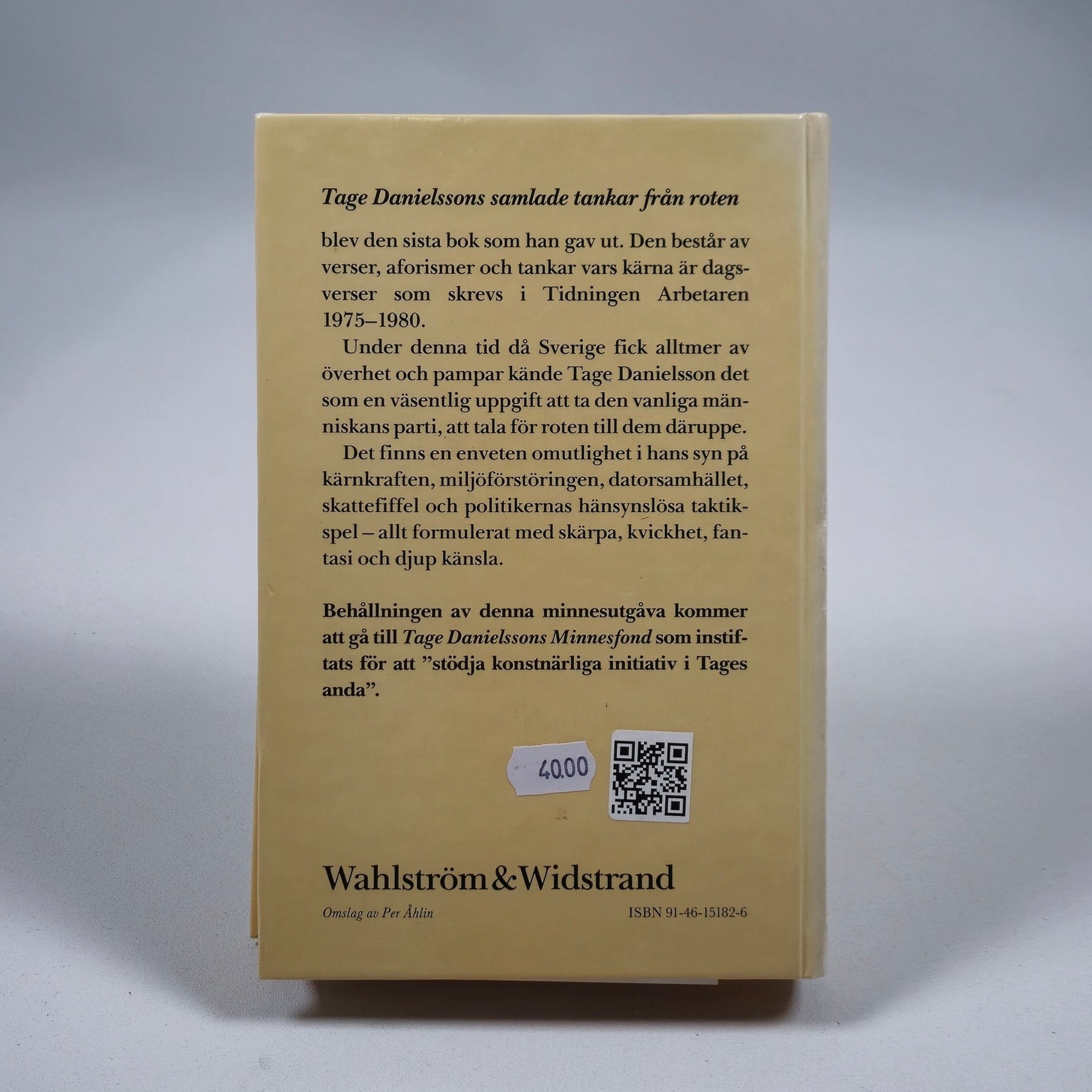 Ett begagnat exemplar av Tage Danielssons populära bok "Tankar från Roten". Boken samlar satiriska verser och texter skrivna under åren 1975–1980. Den är i gott skick med vissa tecken på användning såsom mindre veck på omslaget.