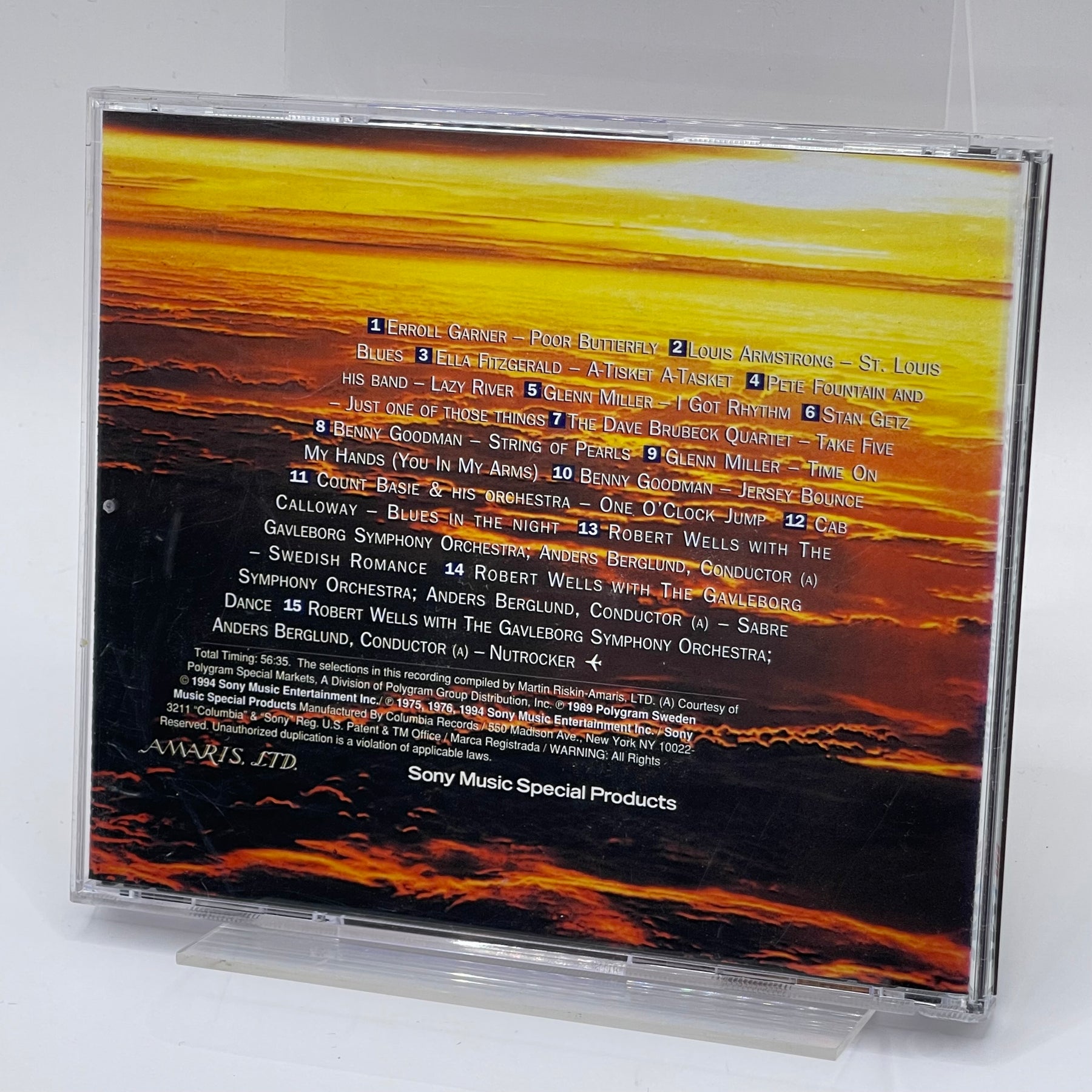 Denna CD-skiva, "Swedish Jazz Masters Series", är en riktig skatt för musikälskare. Den innehåller tidlösa klassiker från legendariska artister som Louis Armstrong, Ella Fitzgerald, och Glenn Miller. CD:n är utgiven av Sony Music Special Products och bjuder på en audiovisuell resa genom jazzens guldålder. Skick: Begagnad men i mycket gott skick.Produktspecifikationer