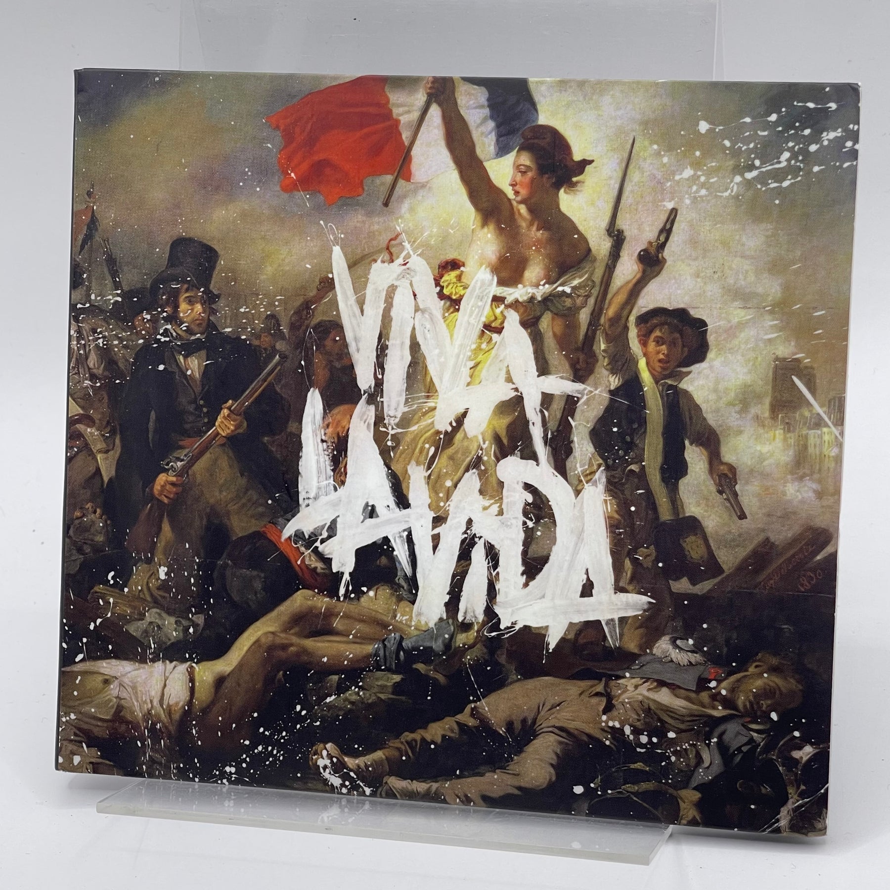 Denna intressanta reproduktion av "Viva La Vida" albumomslaget har en konstnärlig vändning med sin sprayade text över ytan, vilket ger den en rebellisk känsla. Omslaget representerar ett berömt verk av den franske målaren och dess graffiti-stil bidrag ger en unik och modern touch. Lämplig för samlare av musikmemorabilia eller någon som uppskattar konst med en twist. Skick: begagnad med synliga tecken på handling.Produktspecifikationer