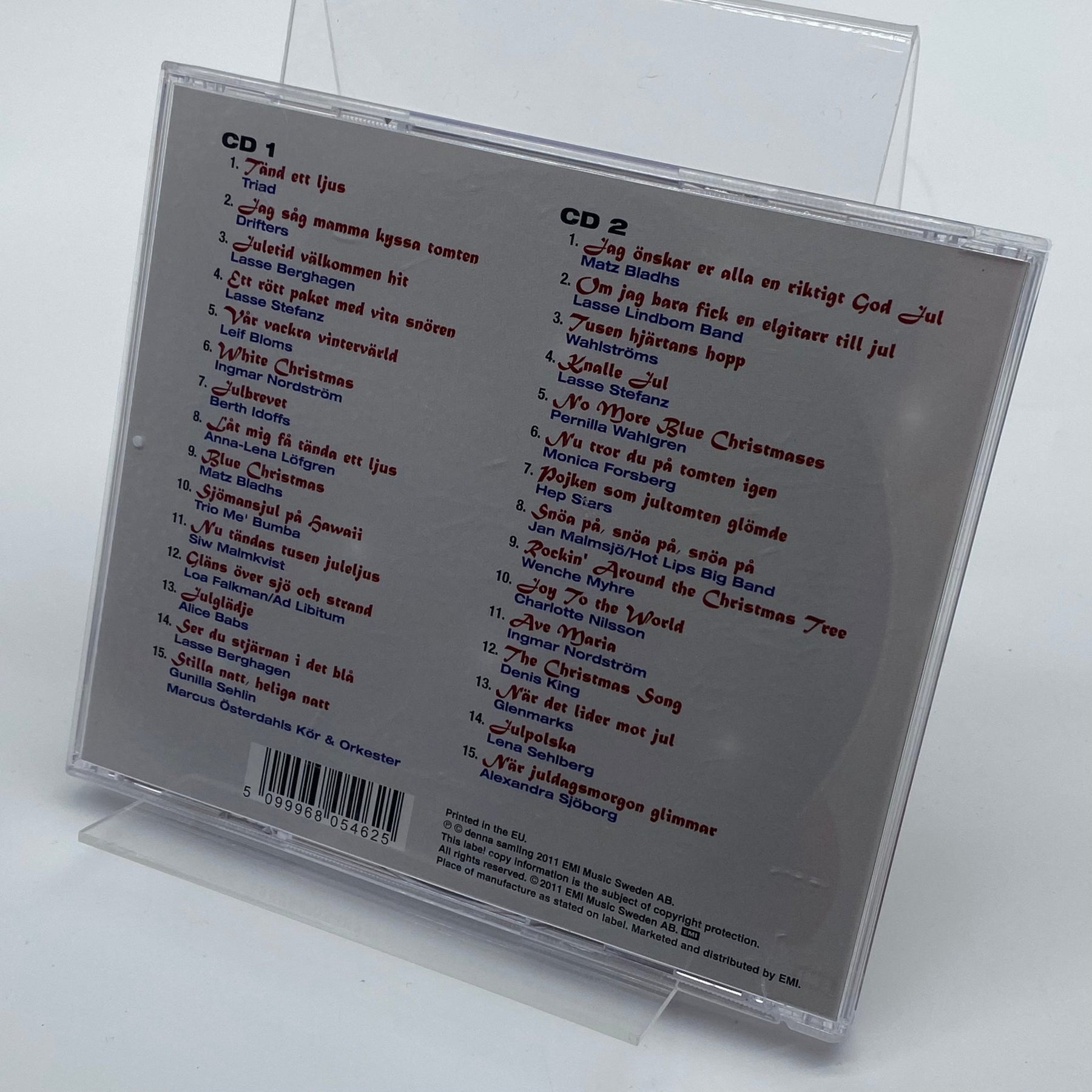 En 2-CD samling med julmusik som innehåller ett brett urval av klassiska och moderna svenska julsånger. Skivorna är i gott begagnat skick, och fodralet har minimala bruksspår, vilket gör dem perfekta för att sprida julstämning.