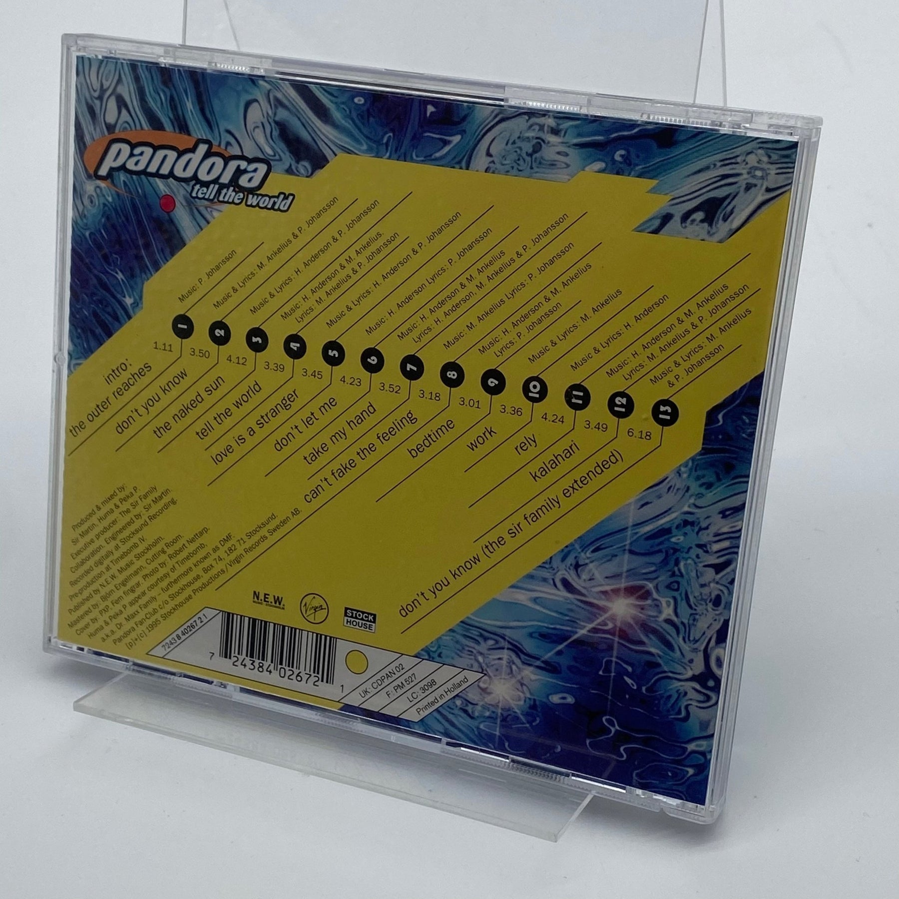 Använd CD med musikalbumet "Tell the World" av artisten Pandora. Perfekt för samlare eller för att återuppleva 90-talets popmusik. Skivan är i gott skick med några ytliga skrapor.