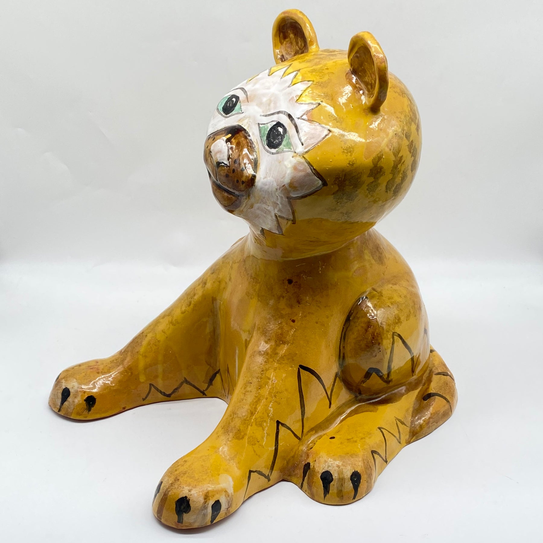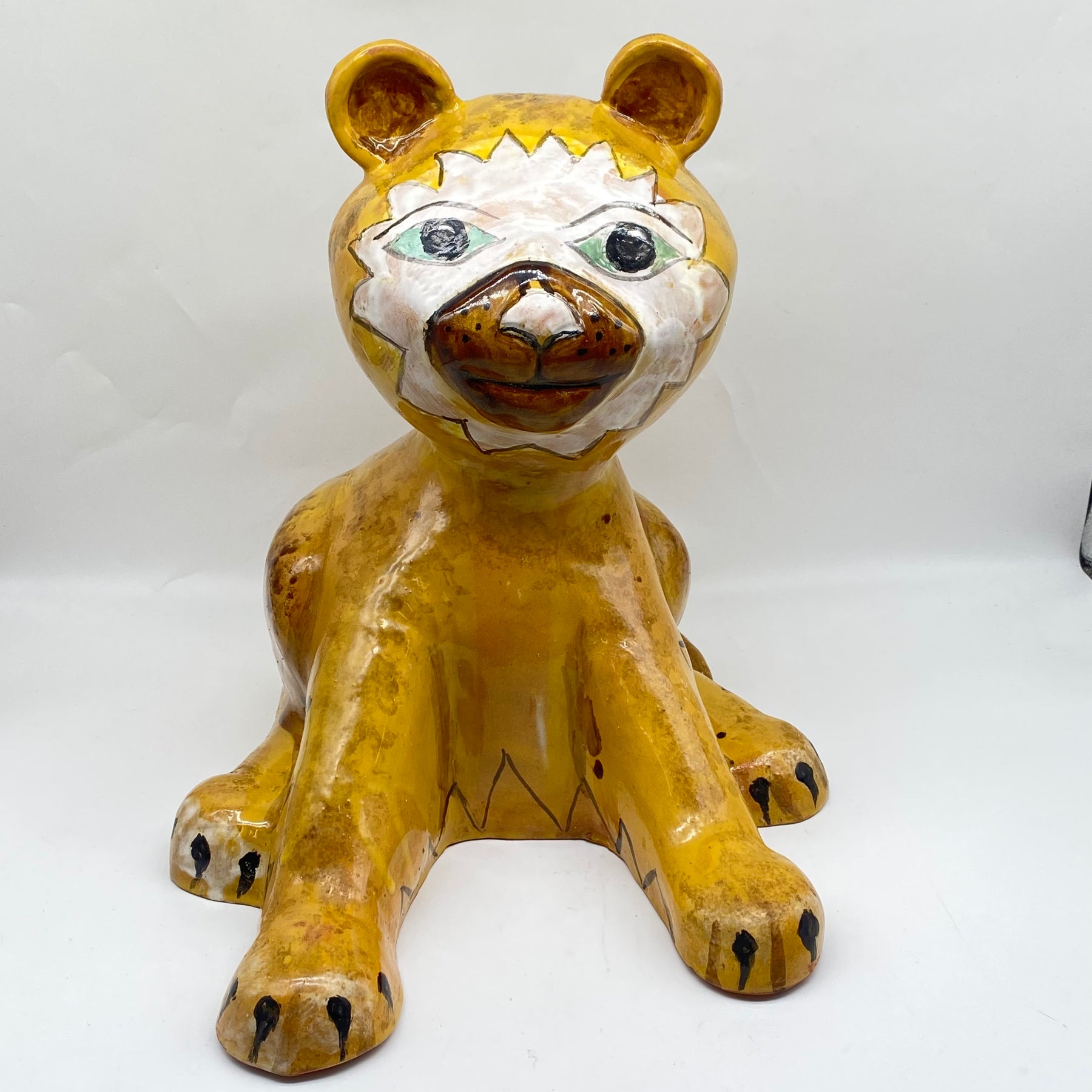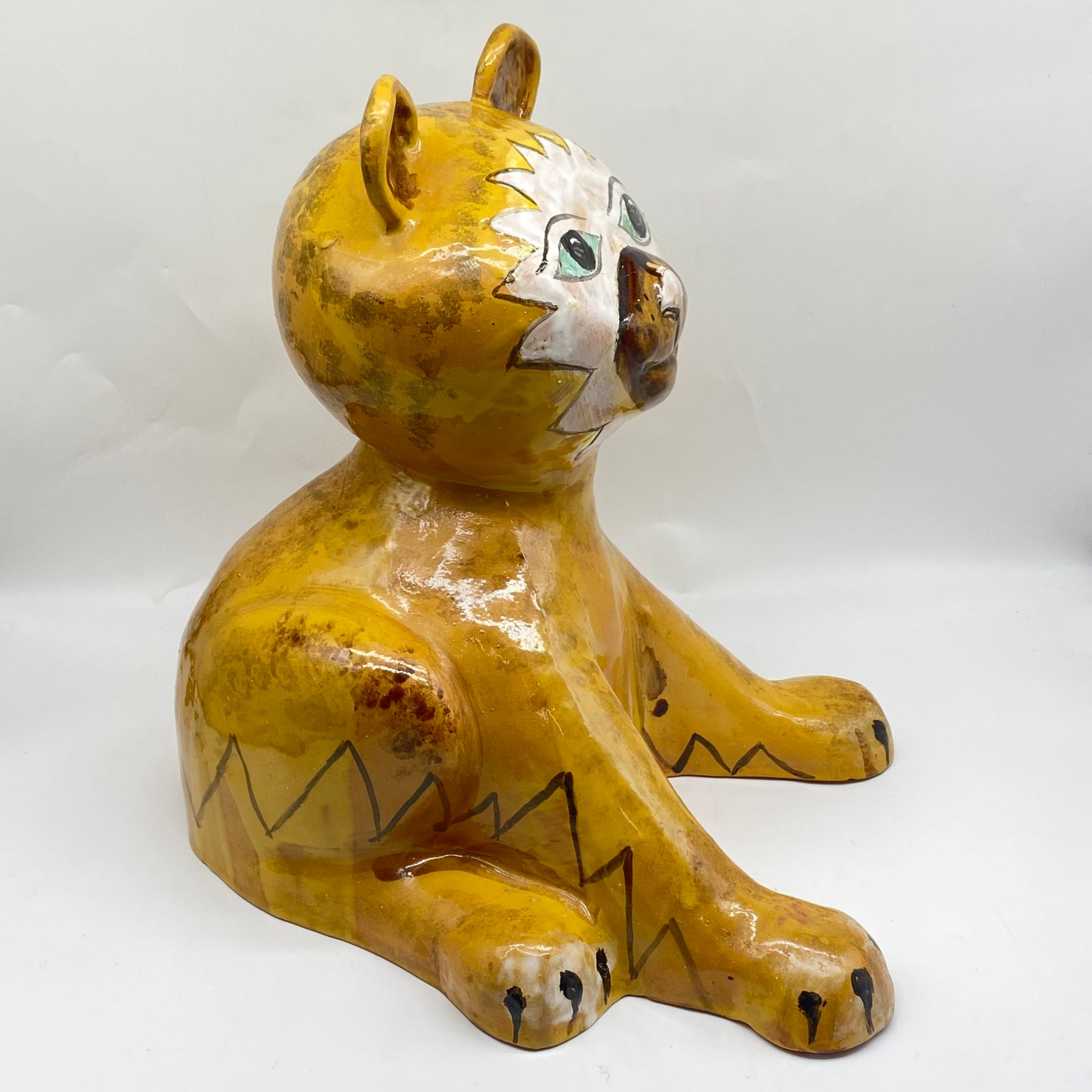 Detta handgjorda keramiklejon fängslar med sin livliga guldfärg och detaljrika design. Lejonet är prydd med expressiva ögon och ett lekfullt leende, vilket ger det en oemotståndlig karaktär. Perfekt som en originell och stilfull dekoration i varje rum. Objektet är begagnat men bibehåller en utmärkt kvalitet och karisma.Produktspecifikationer