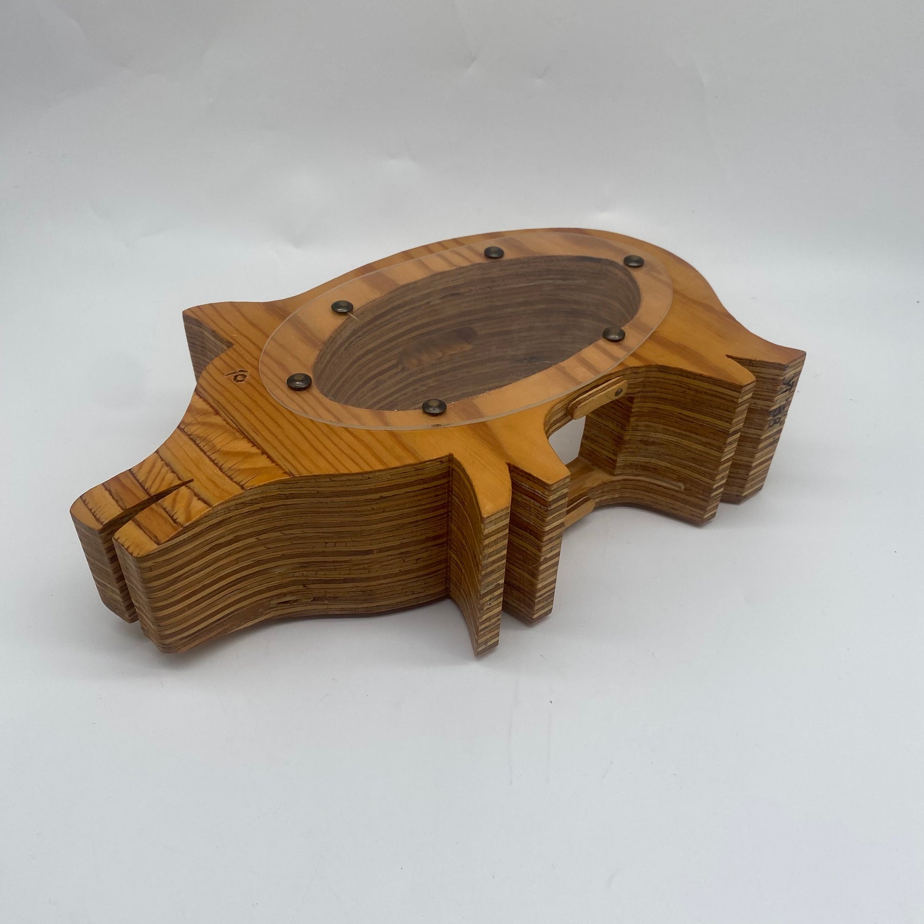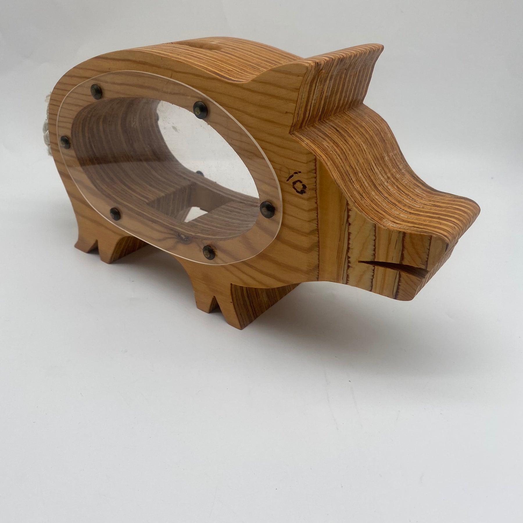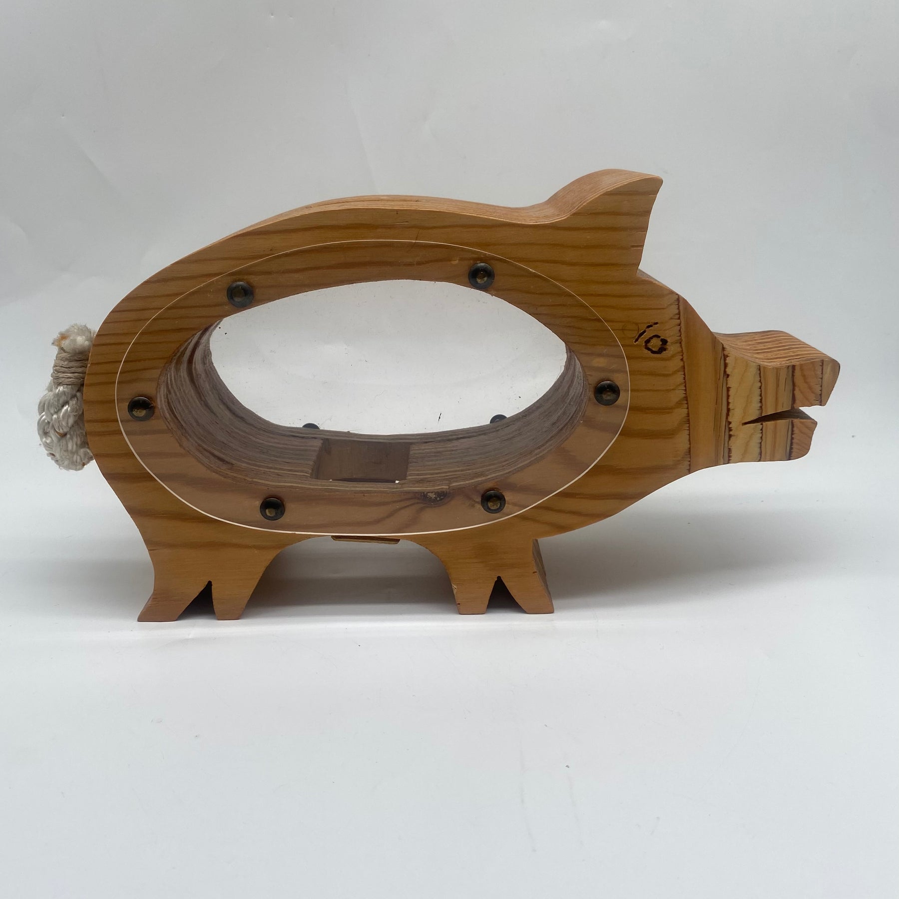 Denna grissparbössa är inte bara ett sätt att spara pengar, men också ett inredningsobjekt som tillför en rustik känsla till varje rum. Tillverkad av vackert lagerat trä med synliga ådror och karaktär, är sparbössan utformad med ett slittåligt snöre för enkel hantering. Den är begagnad men välbevarad, vilket gör den idealisk för såväl praktisk användning som till en charmig detalj i hemmet.