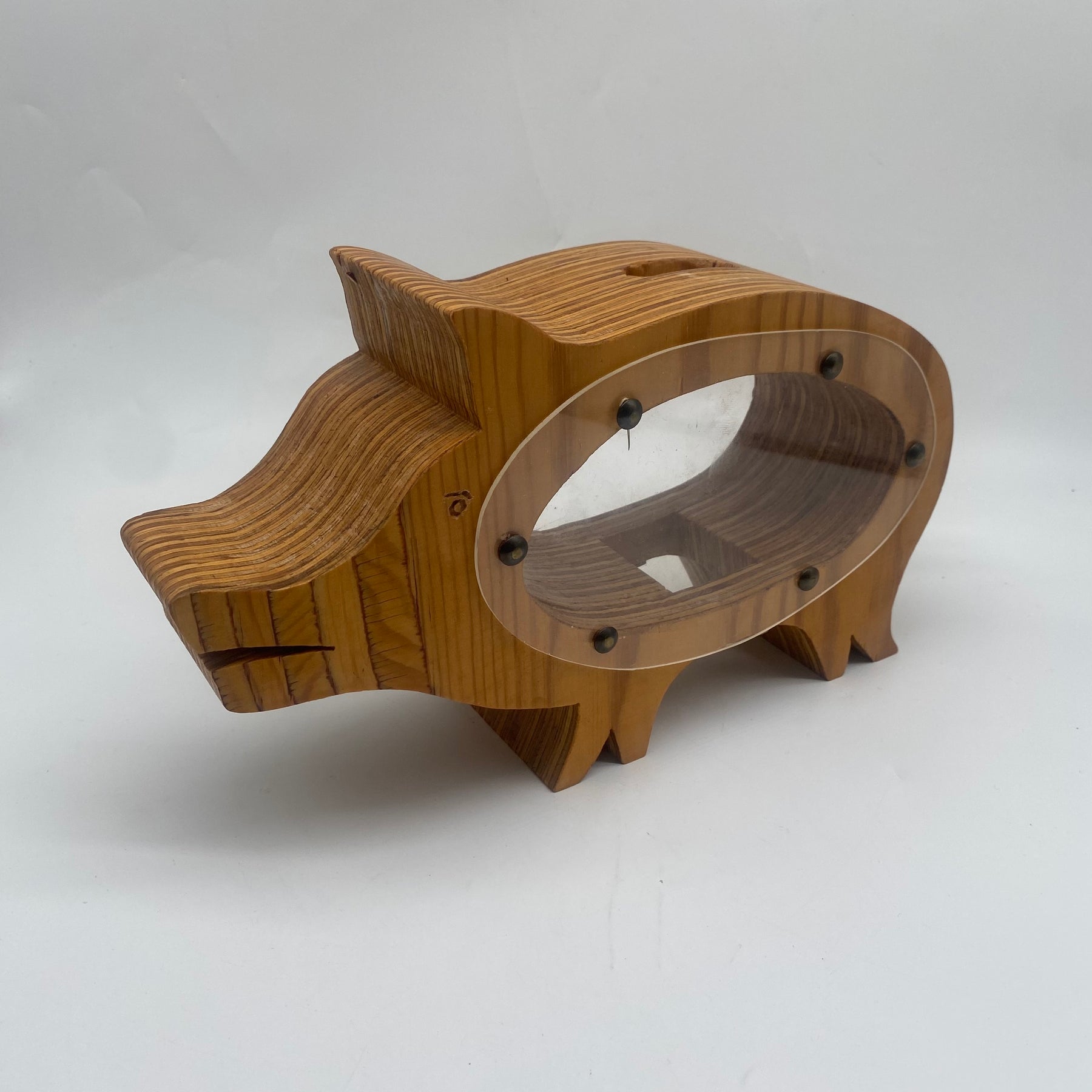 Upptäck denna unika och charmiga grissparbössa i trä, en perfekt kombination av funktionalitet och estetik.