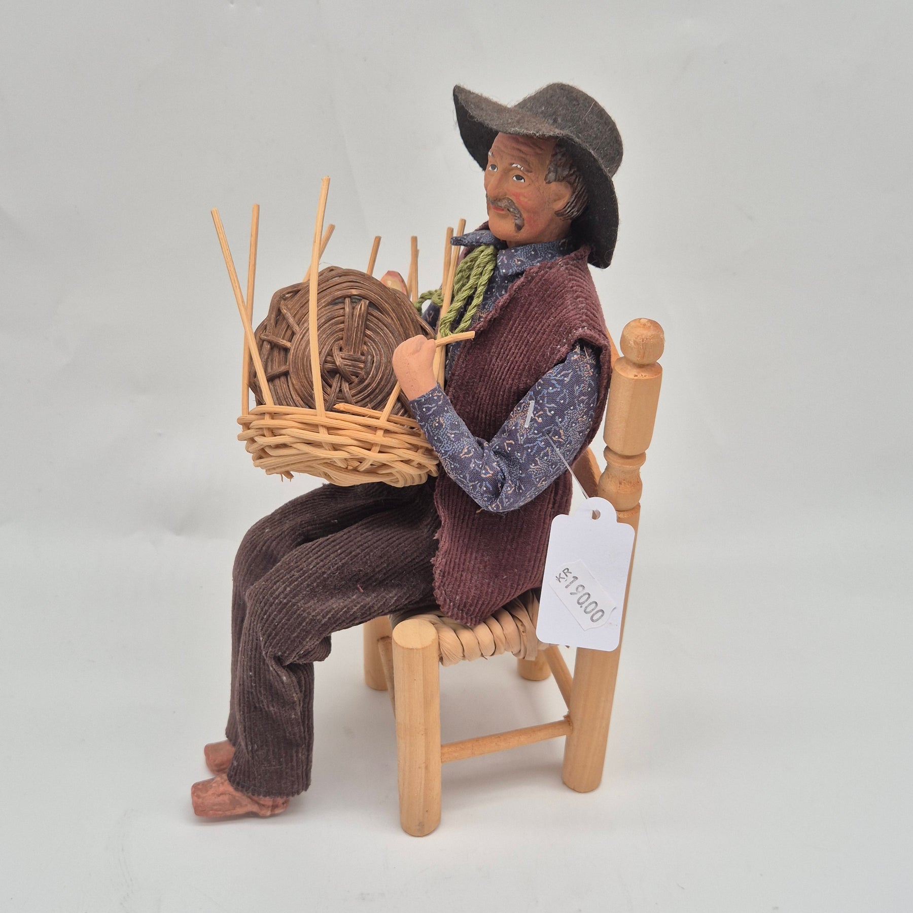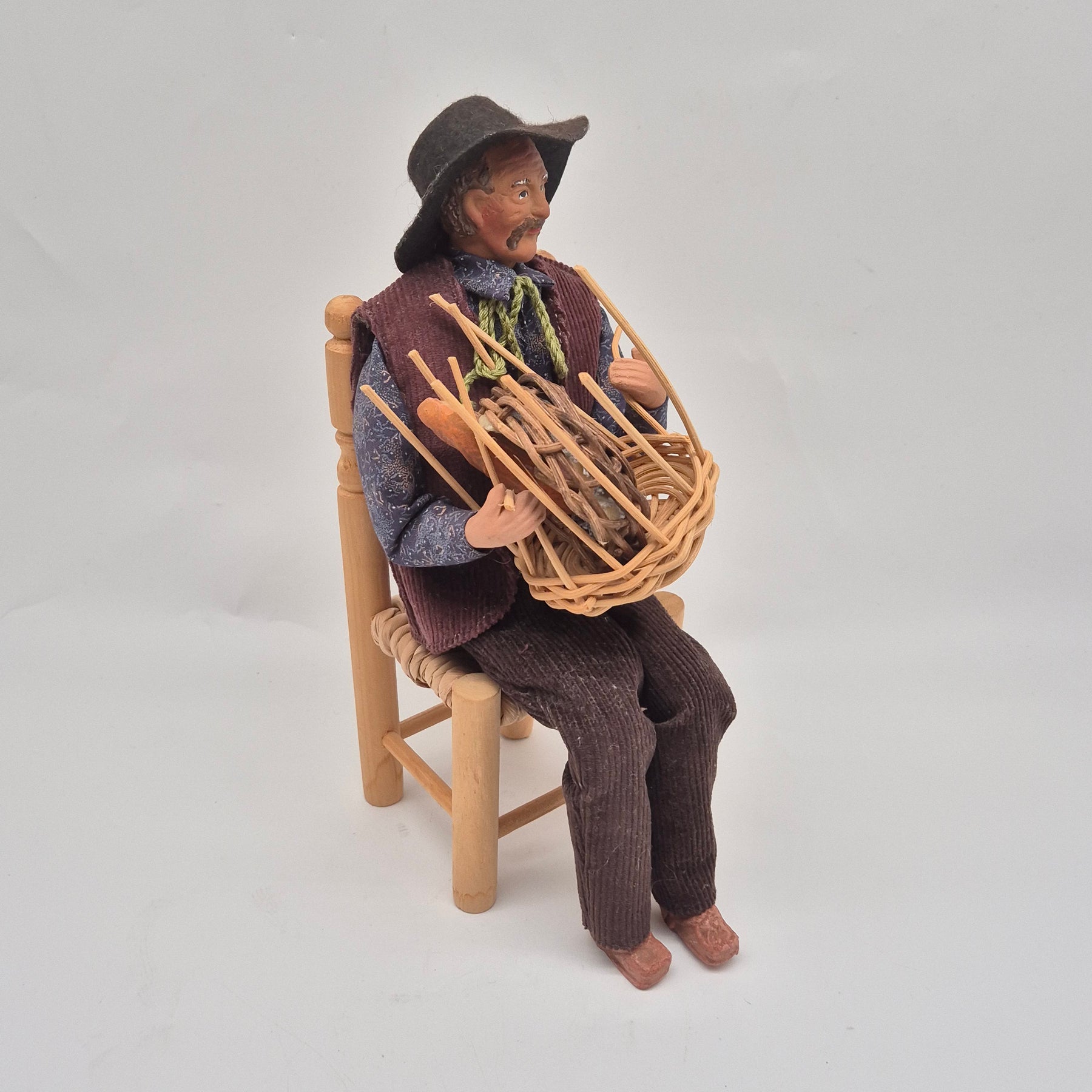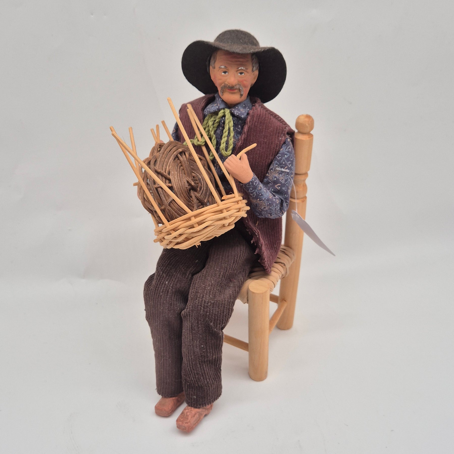 Denna träfigur av en äldre man, sittande på en stol med en korg fylld med ved och hushållsartiklar, utstrålar en rustik och klassisk känsla. Figuren är noggrant handgjord vilket ger liv åt varje detalj, från klädernas textur till uttrycket i ansiktet. Perfekt för samlare eller som ett unikt inslag i heminredningen. Begagnad men fortfarande i mycket gott skick vilket gör det till ett utmärkt tillskott för alla som uppskattar handverk och nostalgi.Produktspecifikationer