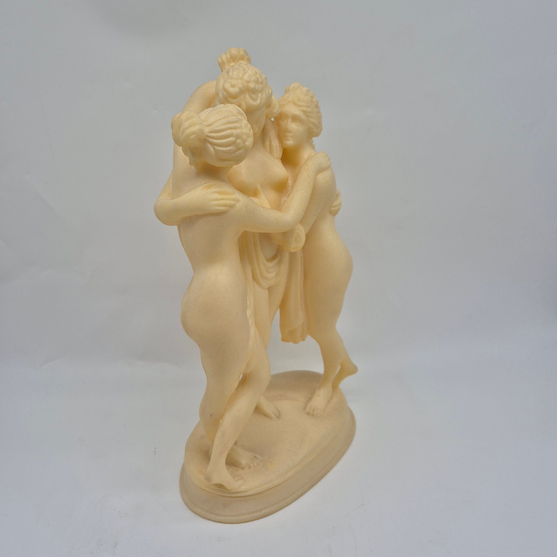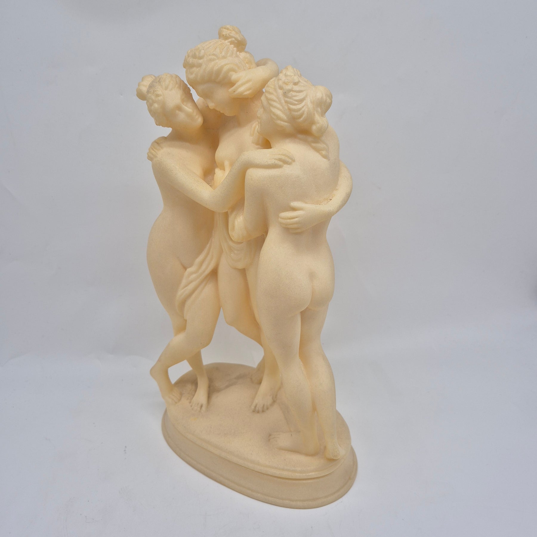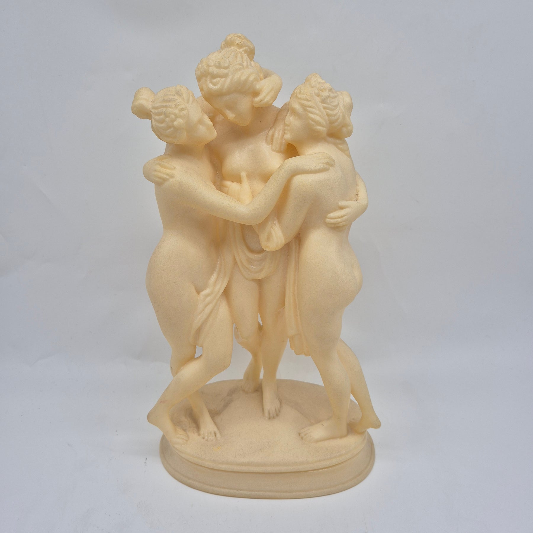Denna utsökta skulptur framställer en grupp av tre figurer i en harmonisk och elegant omfamning, vilket skapar en känsla av rörelse och samhörighet. Tillverkad av högkvalitativt harts med en matt yta som efterliknar marmor, är den här detaljrika statyetten ett iögonfallande tillskott i varje rum. Perfekt för konstälskaren eller som ett unikt inslag i inredningen. Skulpturen är begagnad men i mycket gott skick, vilket gör den till ett utmärkt val för den som uppskattar skönhet och kvalitet.Produktspecifikationer