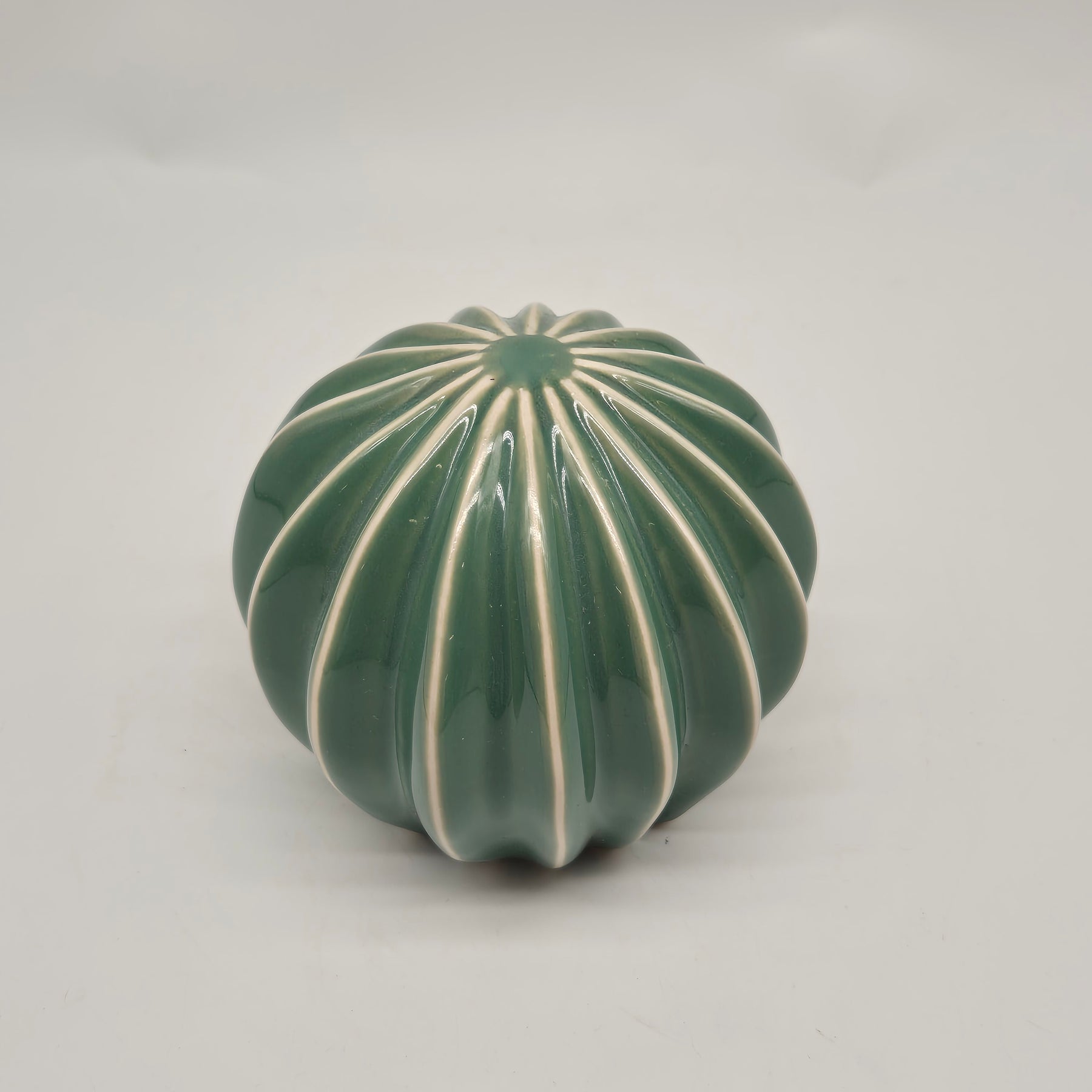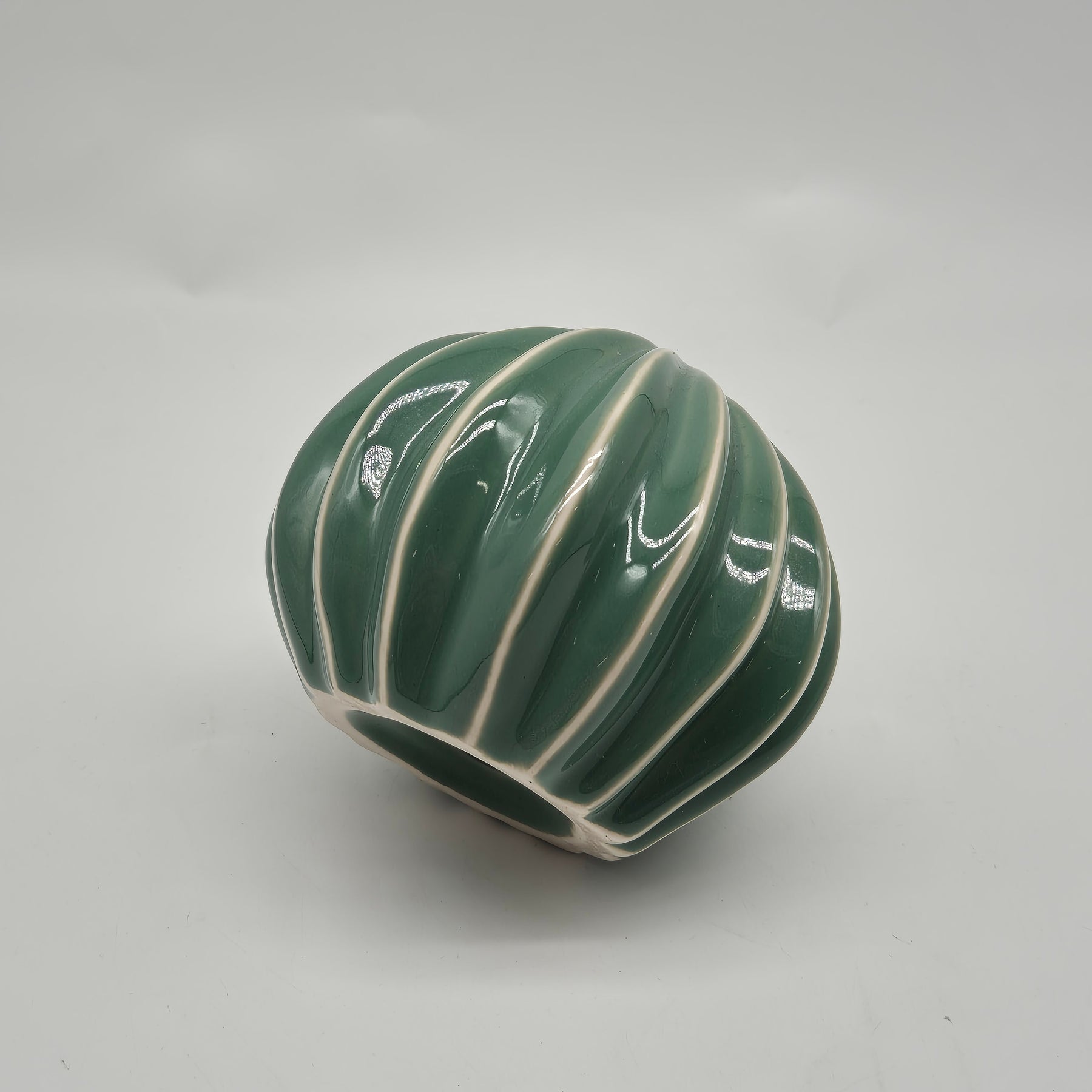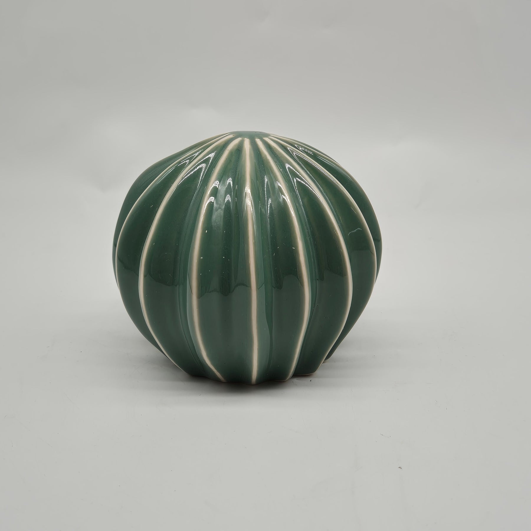 Denna charmiga vas är formad som en pumpa med en djupgrön glasyr som ger en lugn och vacker estetik till vilket rum som helst. Den är skickligt tillverkad i keramik, och designen är inte bara inbjudande utan också praktisk för att hålla små till medelstora buketter. Vasen är begagnad men i utmärkt skick, vilket gör den till ett utmärkt tillskott i hemmet eller som en delikat gåva.