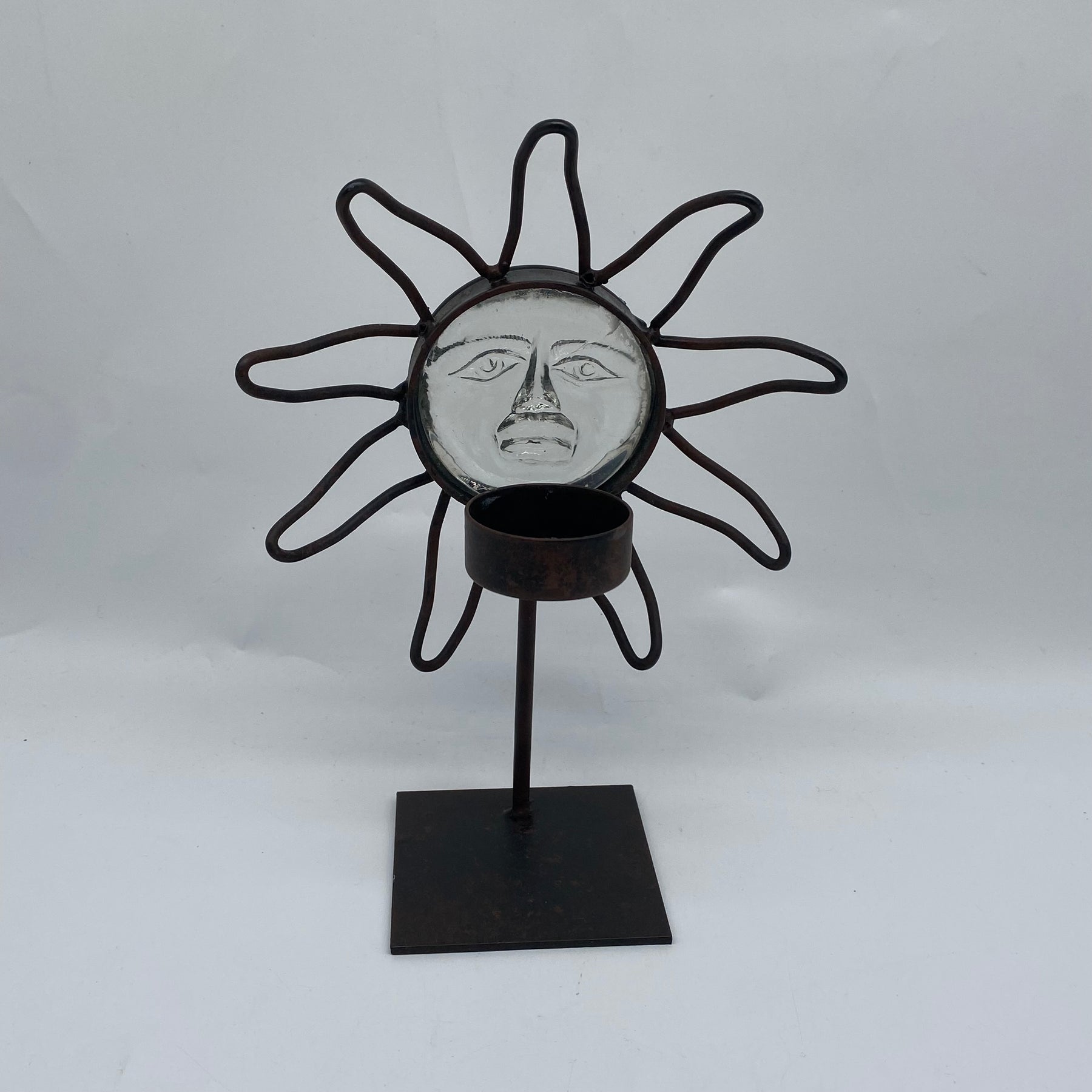 Denna solskulptur får garanterat ditt rum att lysa upp med sitt unika uttryck och detaljrika design. Skulpturen är gjord av metall, med en intressant ansiktsdetalj inramad av strålar som liknar solens. En perfekt detalj för att tillföra lite extra personlighet och konstnärlig känsla i ditt hem eller trädgård. Trots att den är begagnad är den i gott skick och har bara mindre tecken på användning som bidrar till dess charm.