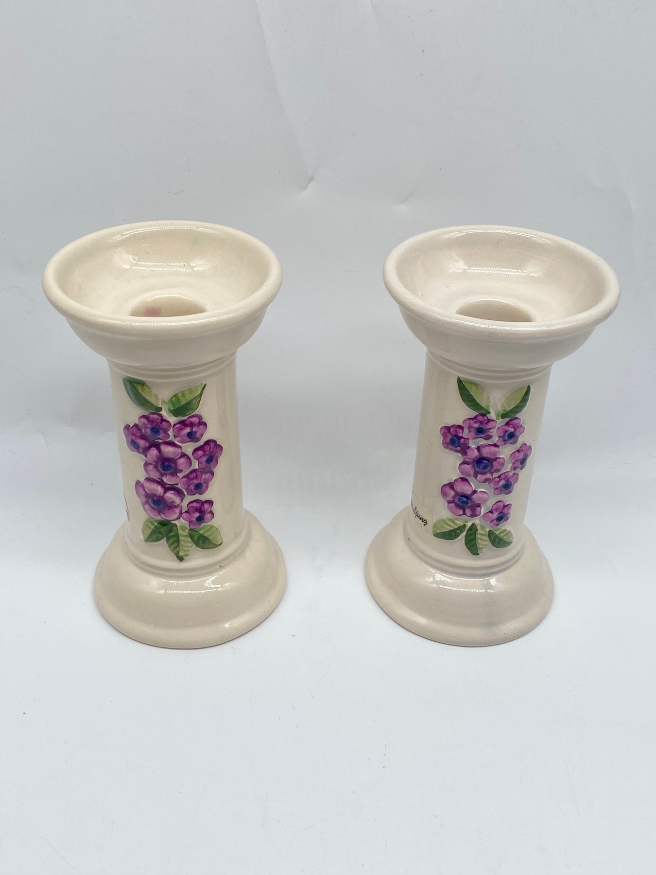 Dessa två vitglaserade keramikljusstakar är utsmyckade med vackra handmålade motiv av blå druvklasar, vilket ger dem en unik och attraktiv utseende. Märkta med "Rosa Ljung," en uppskattad tillverkare känd för kvalitet och stil i keramikvärlden. Dessa ljusstakar är inte bara dekorativa utan också funktionella och håller dina ljus stadigt och säkert. I mycket gott skick, de här ljusstakarna är ett perfekt komplement till varje hem som värdesätter tradition och stil.