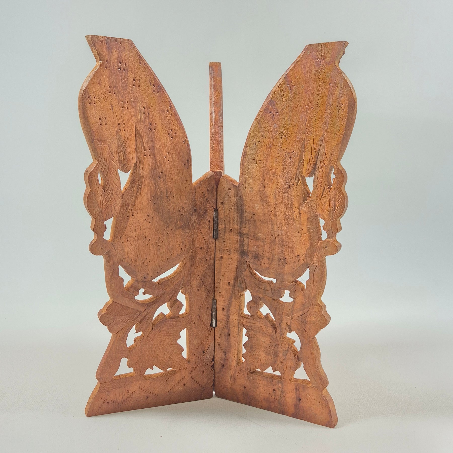 Denna vackra träbokstöd är snidad i ett iögonfallande bladmönster som inte bara är estetiskt tilltalande utan även funktionellt för att hålla dina böcker organiserade. Perfekt för dig som älskar handgjorda och unika föremål. Bokstödet är begagnat men välbevarat, vilket gör det till ett hållbart val för miljömedvetna inredningsentusiaster.