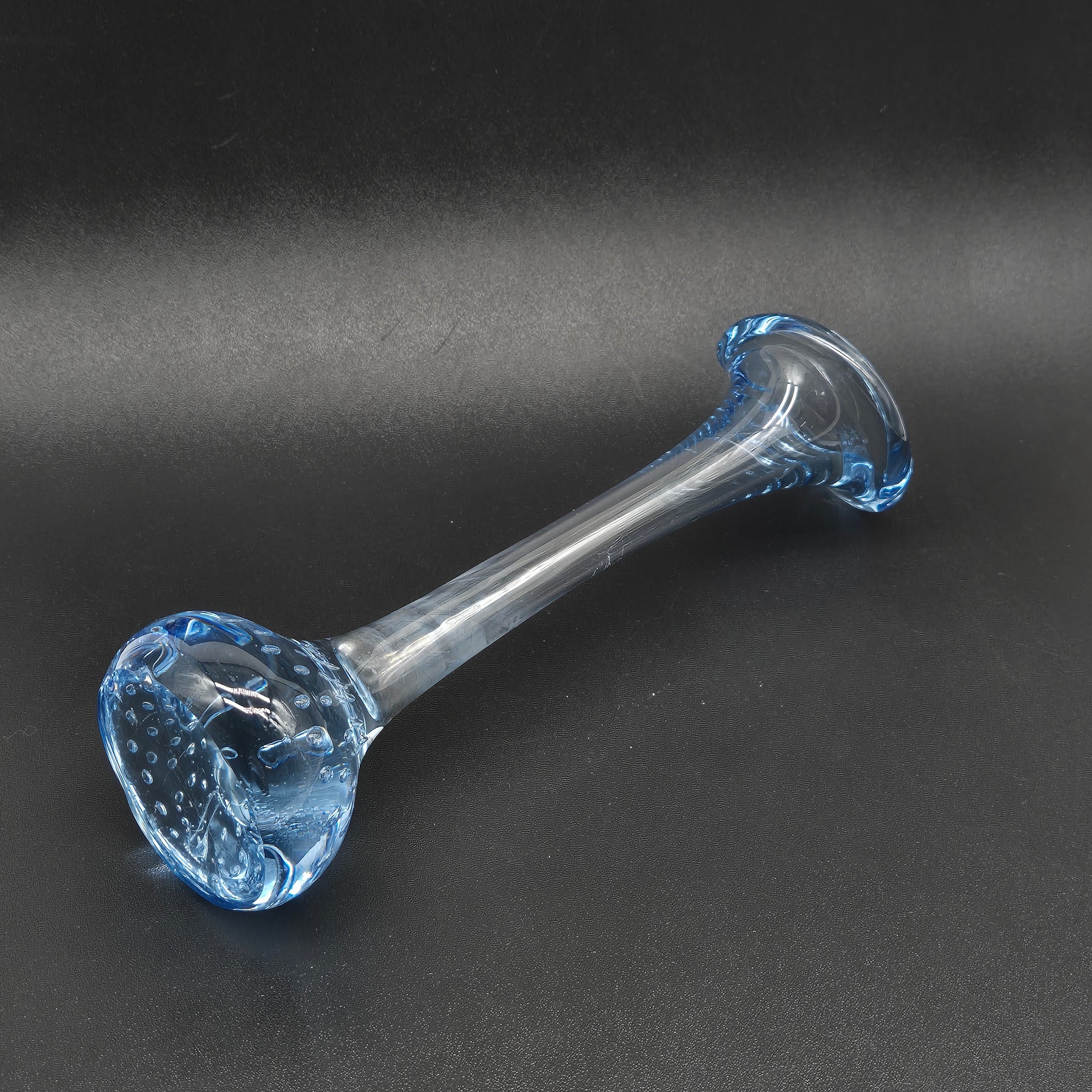Denna stilfulla vas är tillverkad av genomskinligt glas med en charmig botten i blått som smyckar dess utseende. Den är både dekorativ och funktionell, perfekt för att visa upp blommor eller som en fristående skulptur. Vasens design är modern med en retrokänsla, vilket gör den lämplig för både klassiska och samtida inredningar. Produkten är i mycket gott skick och visar minimala tecken på användning.