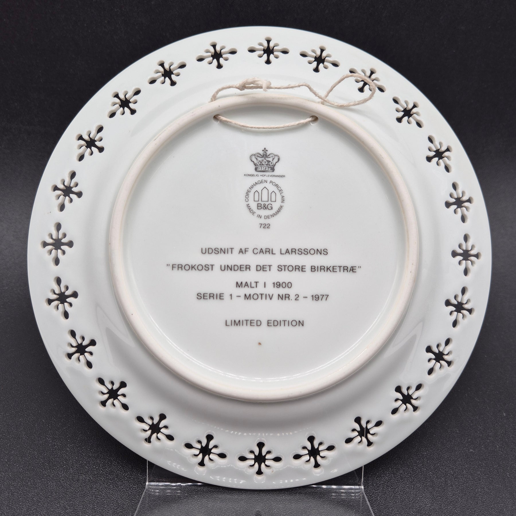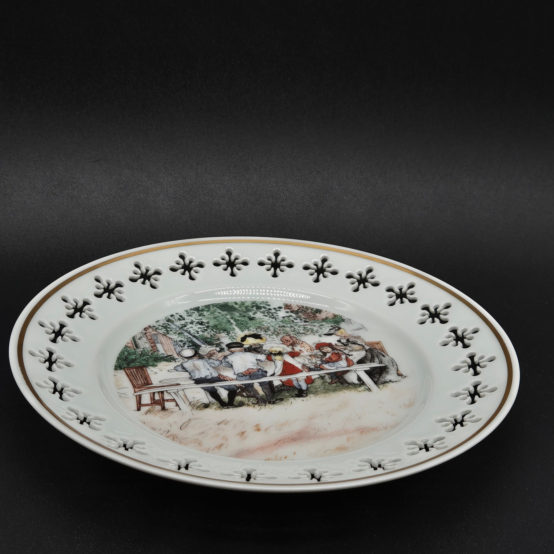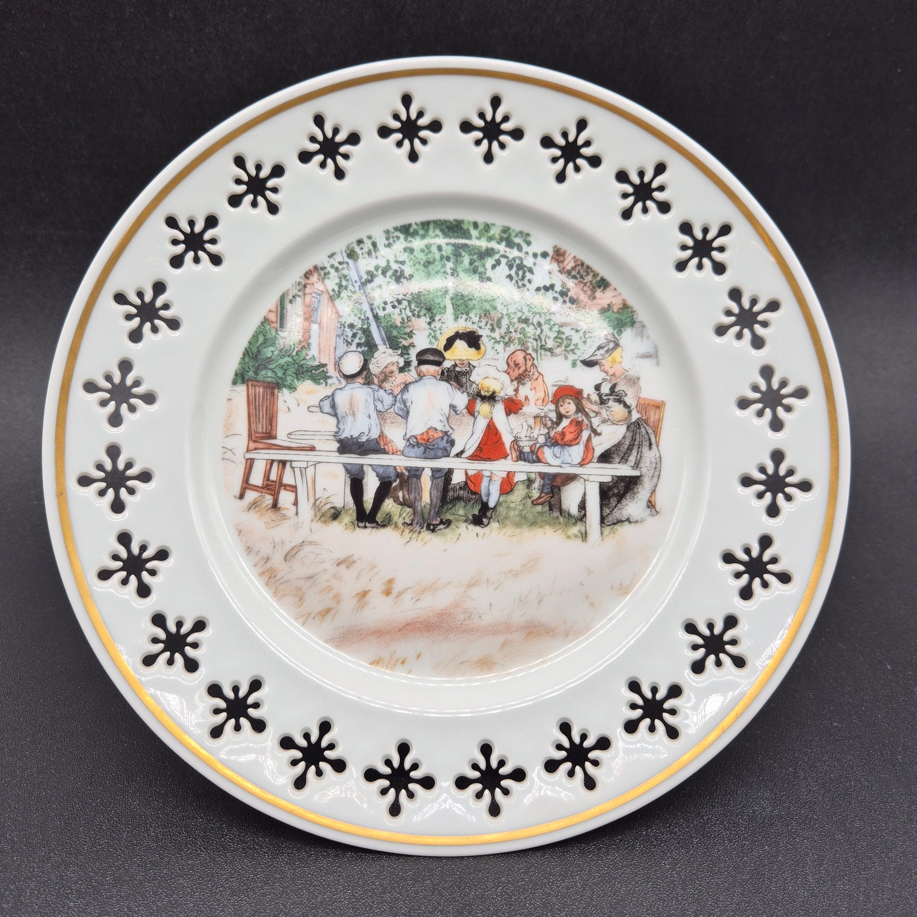 Denna dekorativa tallrik är en begränsad upplaga från serien "Frukost under det stora birketreet", målad av Carl Larsson år 1900. Tallriken är producerad år 1977 och präglas av dess detaljrika och charmiga motiv, omgivet av elegant snökristall-design på kanten. Den representerar en speciell del av svensk kulturhistoria och är idealisk för att berika din samling eller som en unik inredningsdetalj. Tallriken är begagnad men i utmärkt skick.Produktspecifikationer