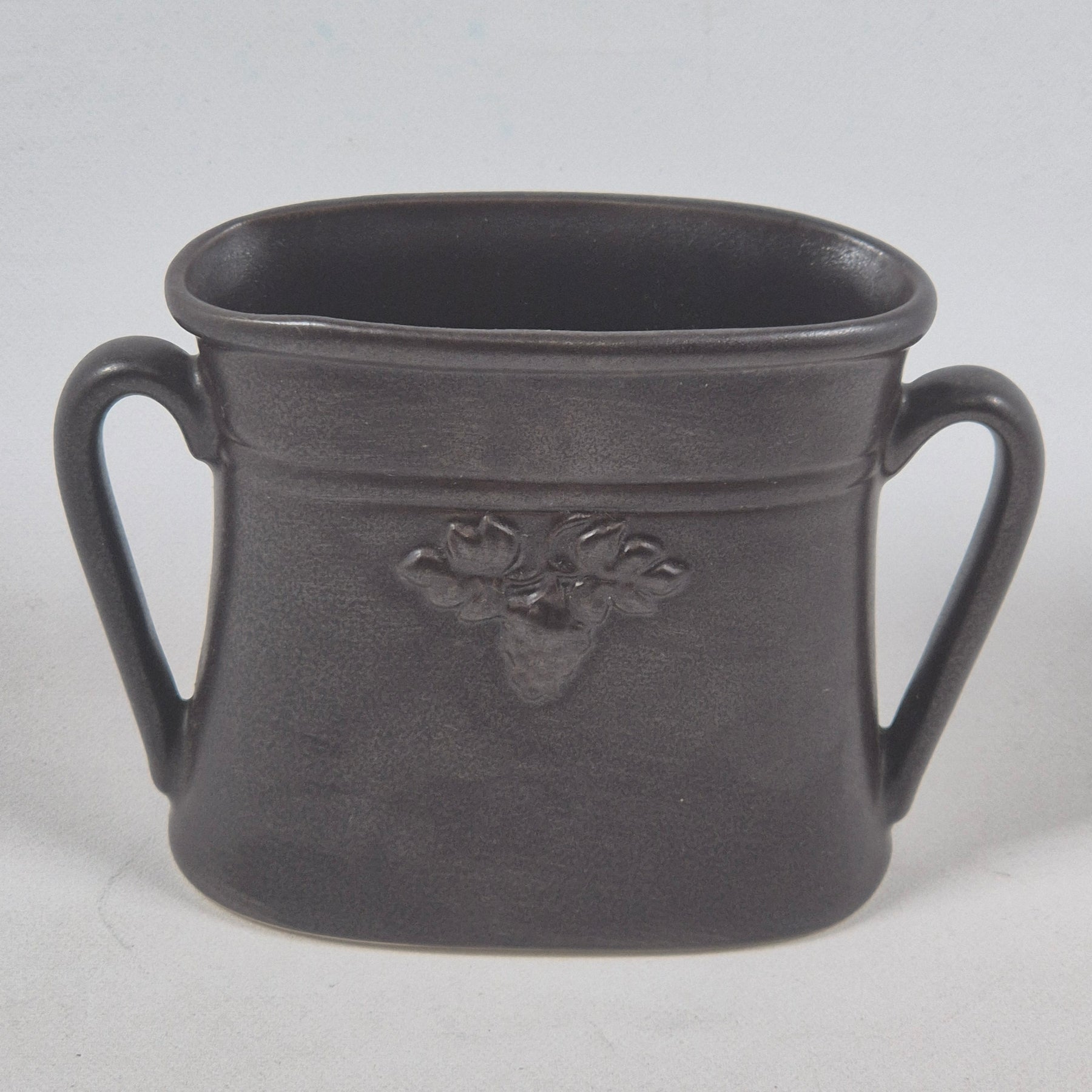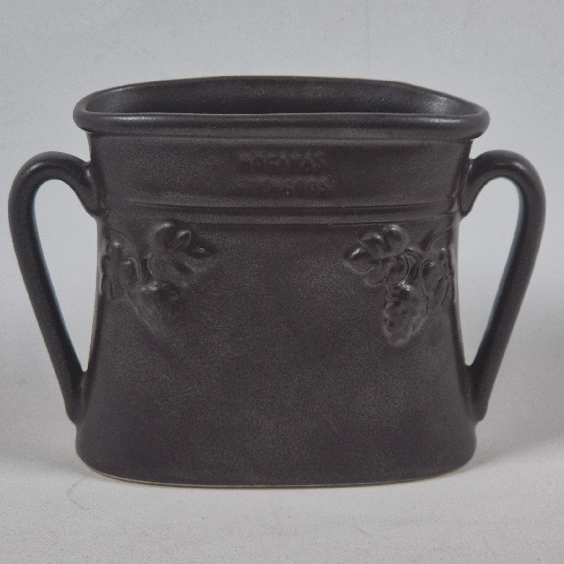Denna eleganta kruka är tillverkad av Höganäs Keramik, känt för sin högkvalitativa stengods. Den mörkgrå färgen och den dekorativa detaljen med ett reliefmönster av en druvklase gör den till en stilfull inredningsdetalj för varje hem. Krukan är perfekt för att plantera örter eller som en del av en rustik inredningsensemble. Skicket är begagnat men välbevarat, vilket gör den både charmig och funktionell.