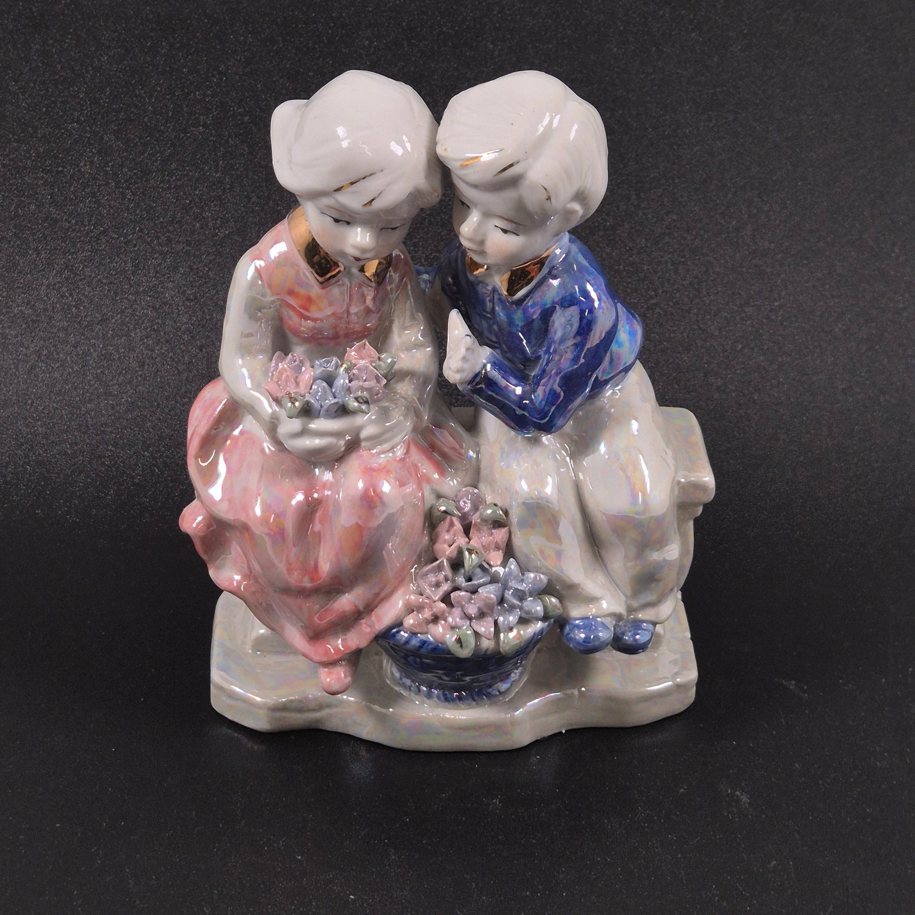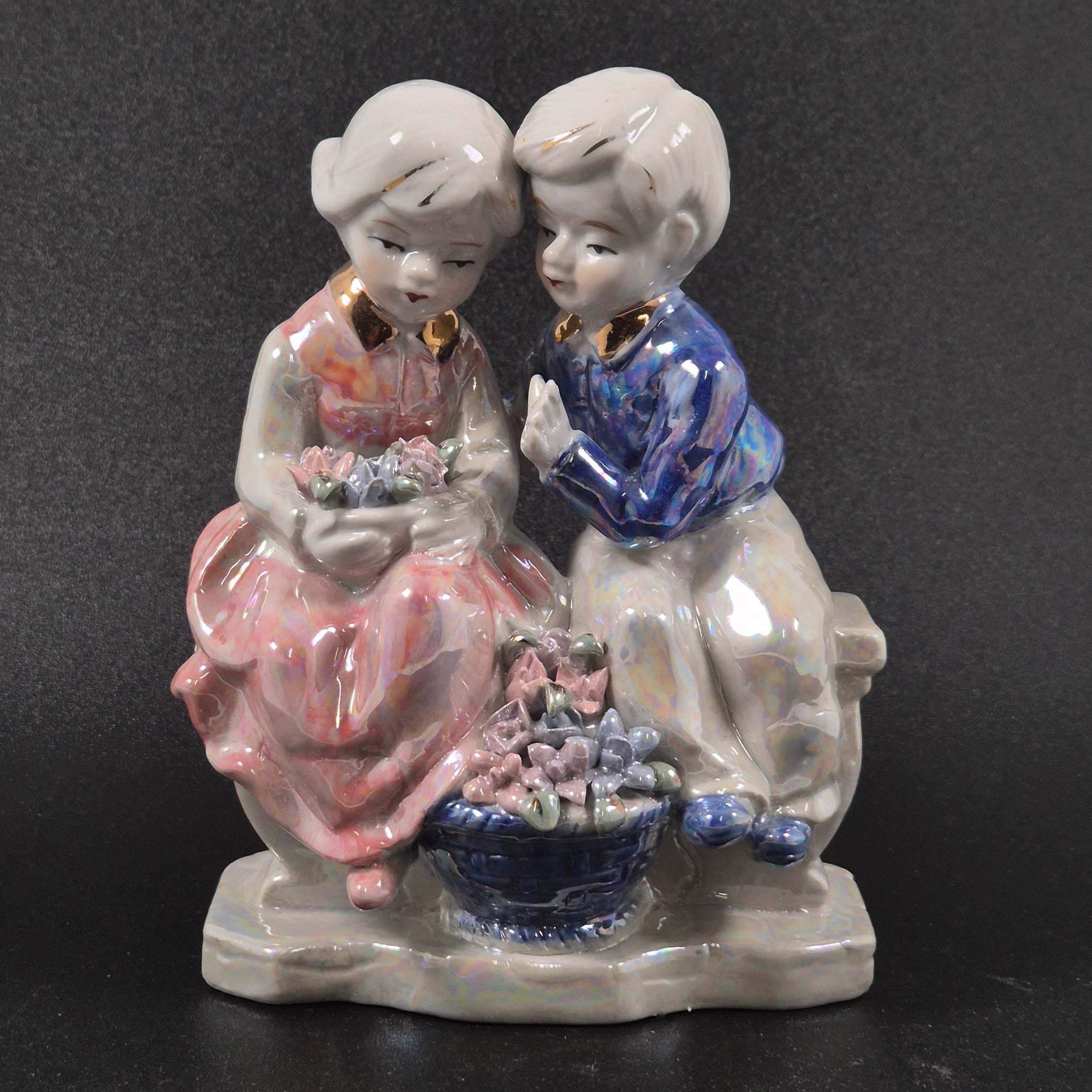Denna charmiga figurin framställer två barn sittande i en intim och lekfull stund, med detaljerat målade kläder och en korg full av blommor. Tillverkad i högkvalitativt porslin med en glansig finish, förhöjer denna figurin varje rum eller samlarskåp. Den är begagnad men har bevarats i utmärkt skick, vilket gör den perfekt som en dekorativ prydnad eller som en del av en större samling.