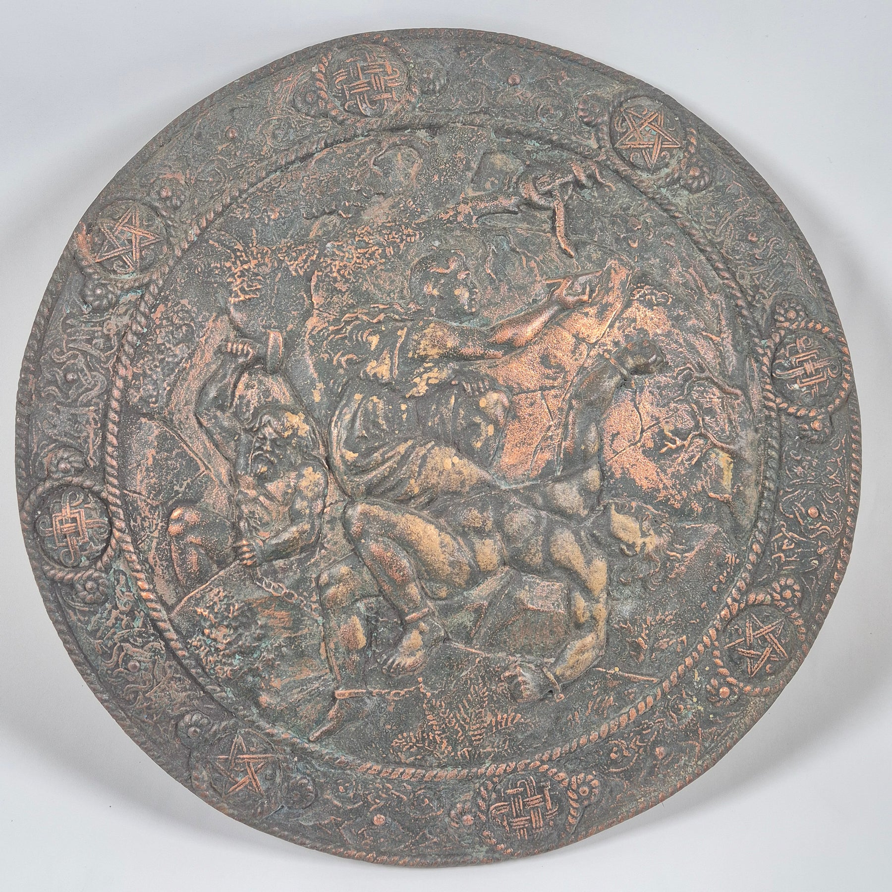 Denna antika koppartallrik är dekorerad med historiska och detaljrika motiv som skapar en oemotståndlig charm. Tallriken är inte bara en praktisk föremål utan också ett imponerande konstverk, perfekt för att addera ett stycke historia i din inredning. Den är begagnad och bär spår av sin tid, vilket bidrar till dess autentiska karaktär.