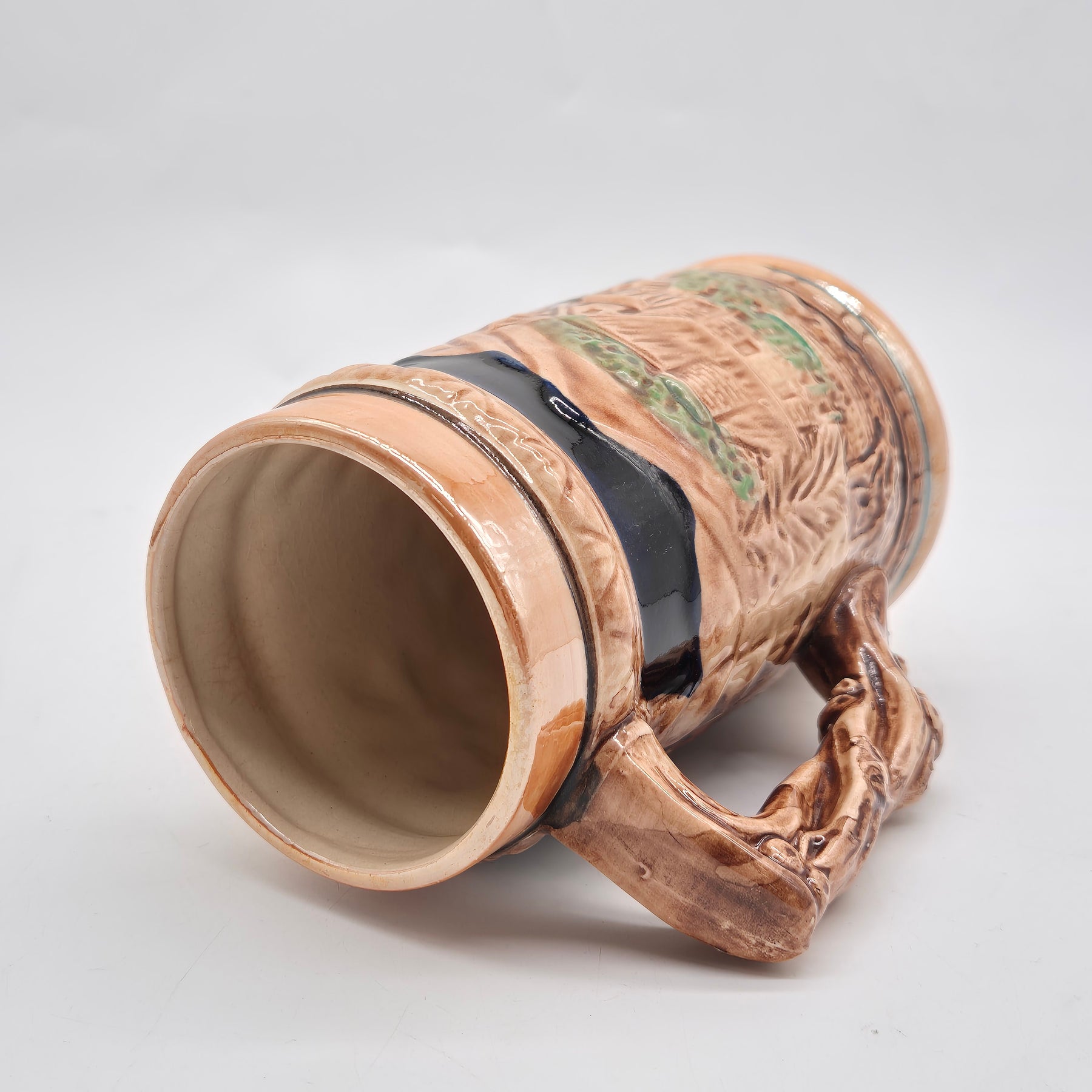 Denna ölsejdel i keramik pryds av handmålade detaljrika scener som fångar essensen av folkloristisk konst. Framsidan visar en lekfull dans mellan två figurer i traditionella dräkter, medan baksidan bjuder på en idyllisk lantlig scen. Perfekt för samlare av vintageföremål eller som en särskild gåva till någon som uppskattar tradition och hantverksmässig skönhet. Sejdeln är begagnad men har bevarats i mycket gott skick och visar inga tecken på slitage.