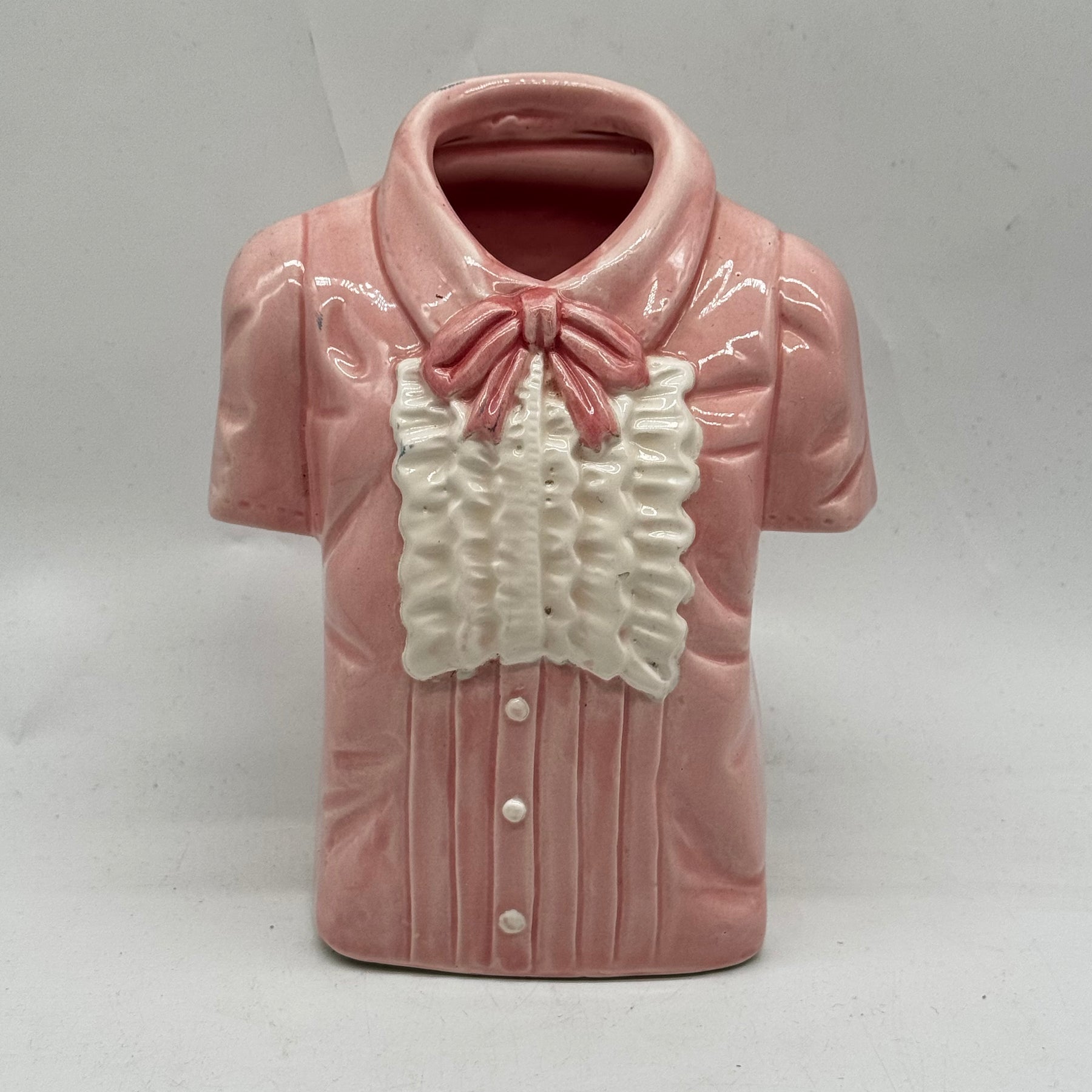 Denna dekorativa vas, formad som en blus, är tillverkad i en ögonfångande rosa nyans med detaljer som knappar och en dekorativ rosett. Vasen är framställd i Taiwan och erbjuder en unik inredningsdetalj som passar perfekt på hyllan eller som en originell blomsterhållare. Trots att den är begagnad är skicket mycket gott, med endast mindre tecken på användning.