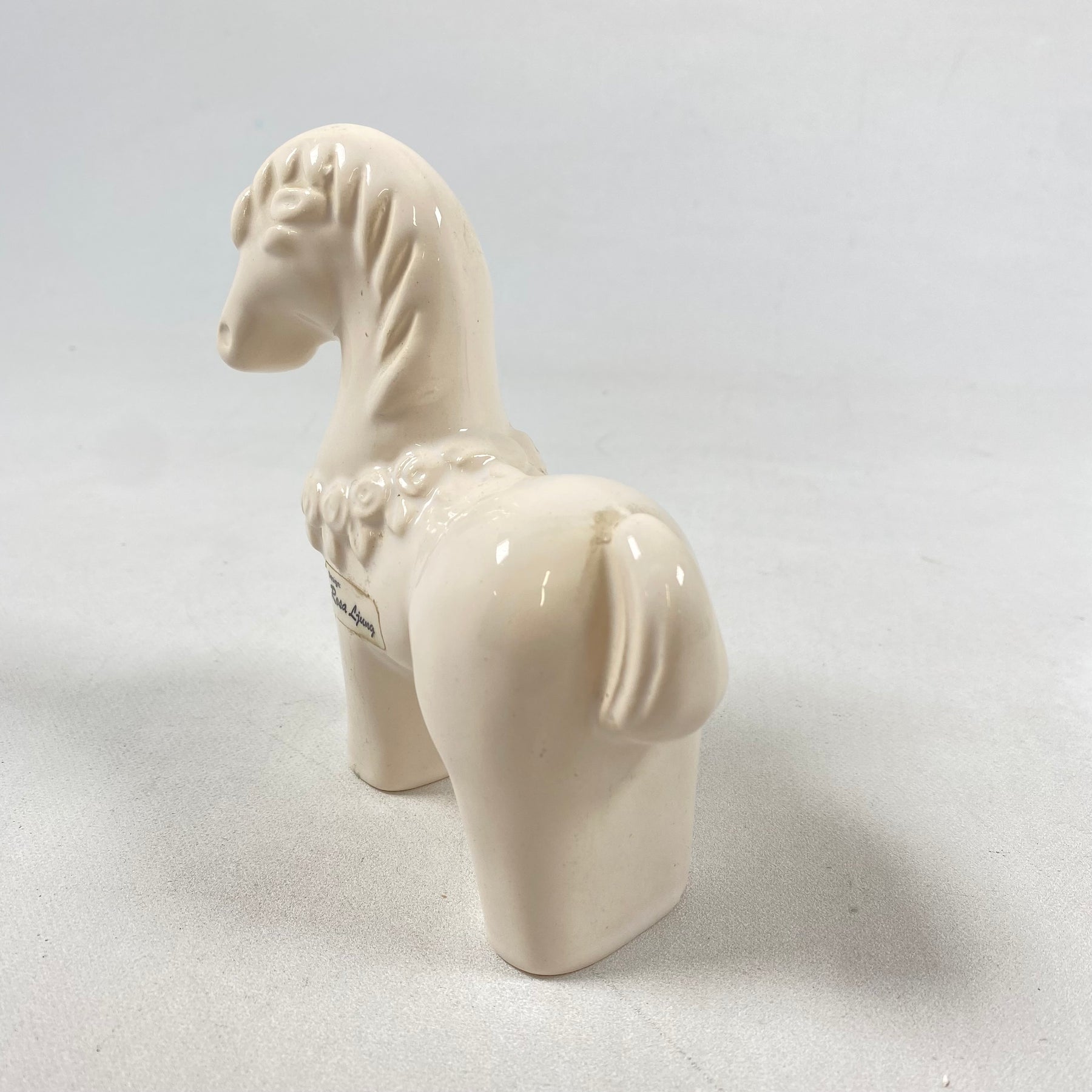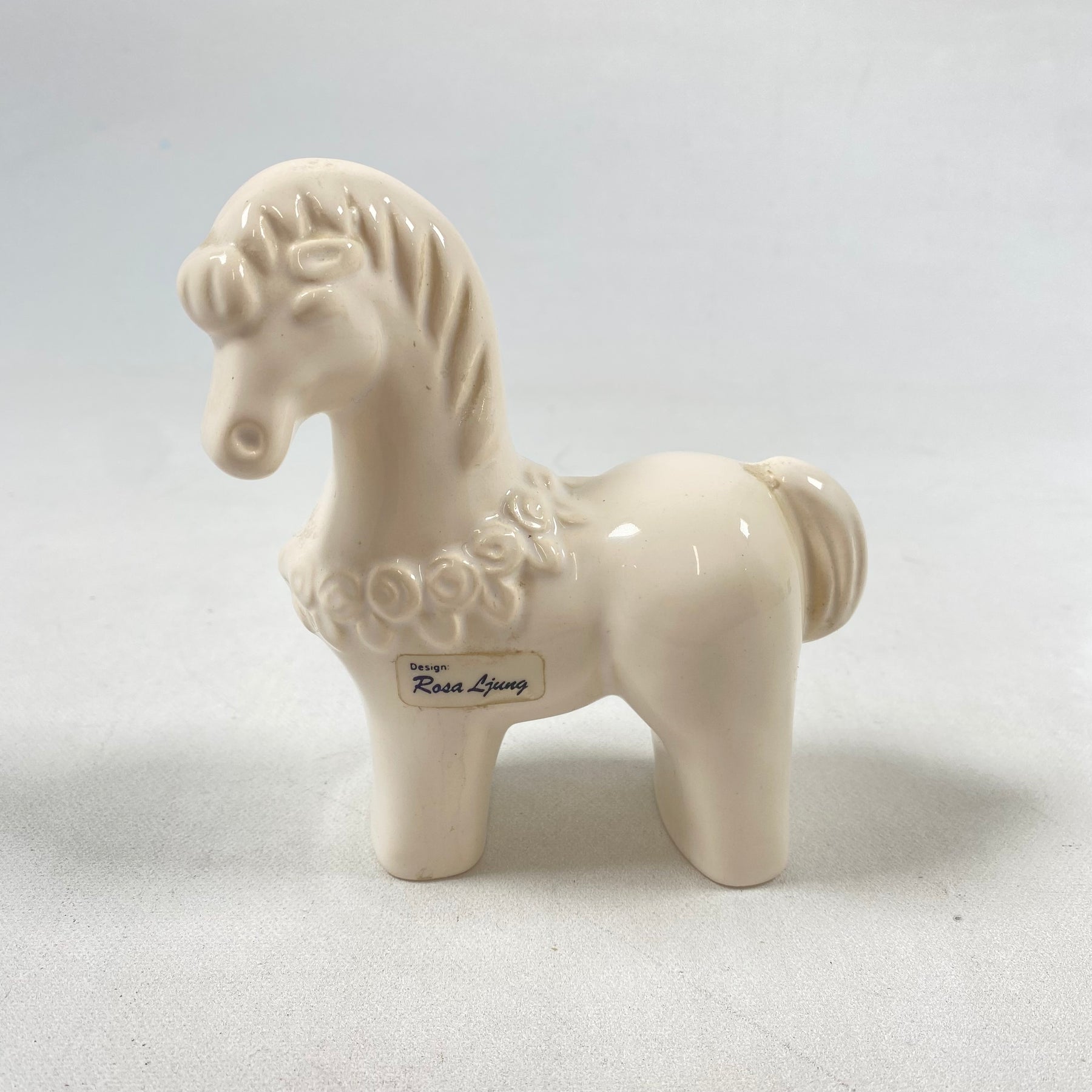 Denna vita prydnadshäst är designad av den berömda svenska formgivaren Rosa Ljung, känd för hennes distinkta och tidlösa keramik. Hästens detaljrika utförande och stilrena form gör den till ett utmärkt tillskott i varje svensk hem. Dess kompakta storlek och glansiga finish förhöjer varje rum den placeras i. Prydnadsföremålet är begagnat men i utmärkt skick, utan synliga sprickor eller skador.