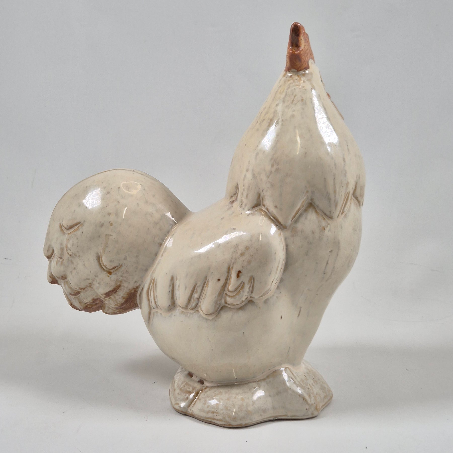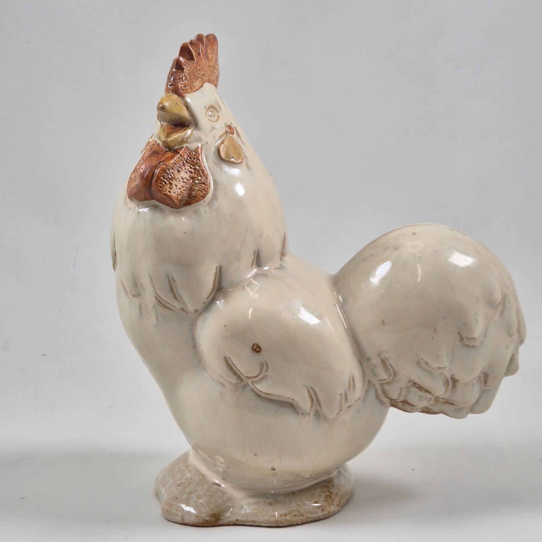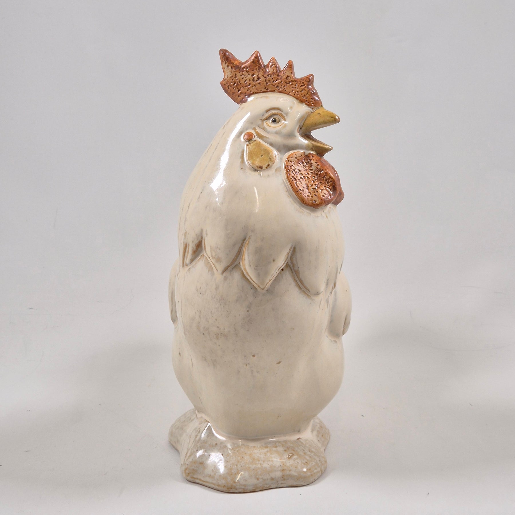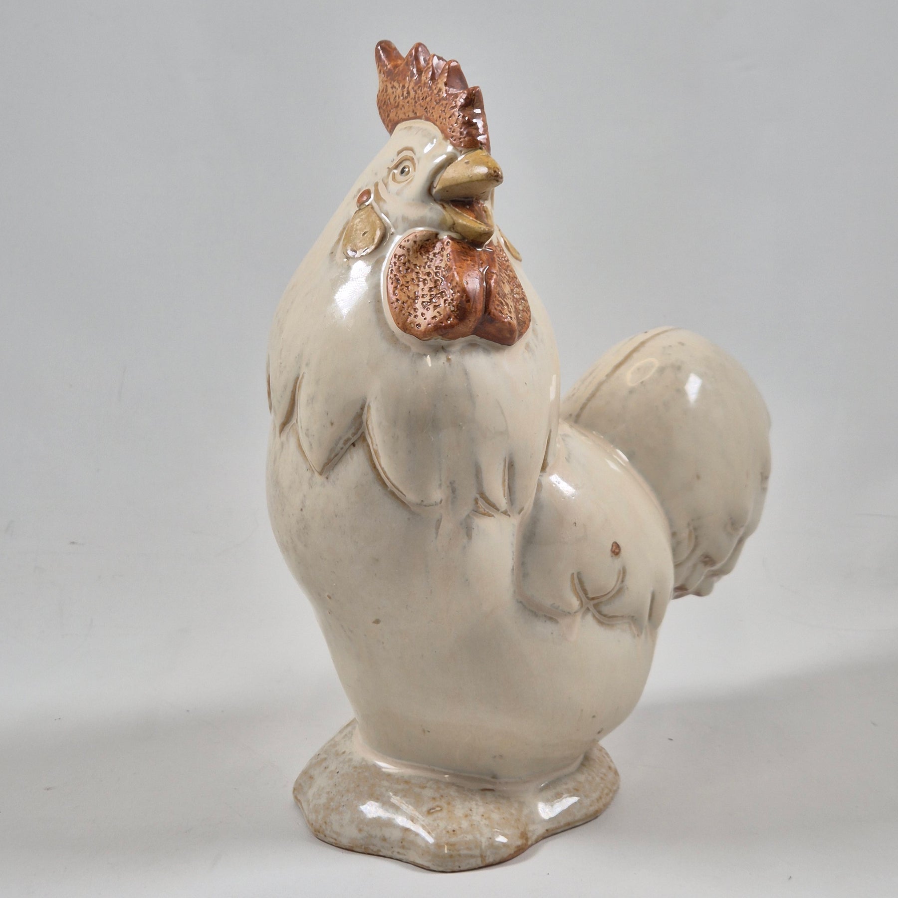 Denna keramiktupp är inte bara en vanlig prydnadsföremål, utan ett verk av hantverksmässig skicklighet med livliga detaljer och en varm, inbjudande utstrålning. Med sin detaljrikedom och realistiska utseende gör den sig perfekt som en del av inredningen i köket eller vardagsrummet. Det är en begagnad artikel men har bevarats i mycket gott skick, vilket gör den till ett utmärkt val för både praktiskt bruk och som en dekorativ höjdpunkt.