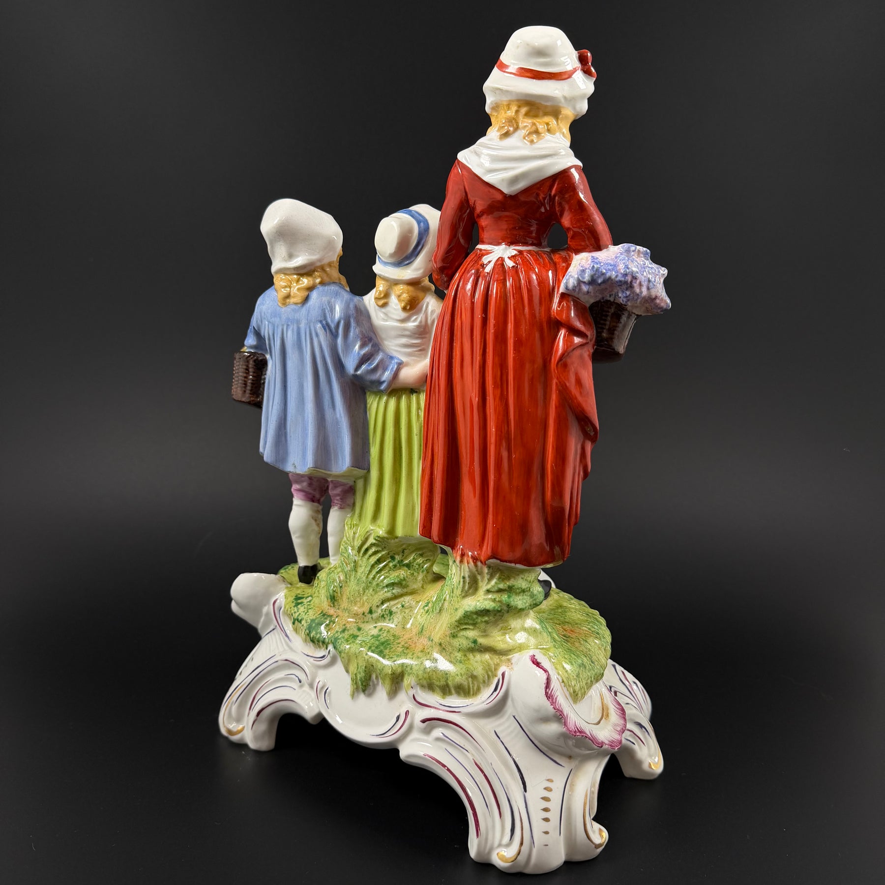 Förgyll ditt hem med denna eleganta och livliga porslinsgrupp från Dresden, känd för sitt hantverk och sin kvalitet. Figuren visar en mor klädd i en röd klänning och hennes barn, båda med korgar, vilka ger ett intryck av en ljus och glad stämning. Denna unika dekorationsbit är inte bara en prydlig detalj utan också ett samlarobjekt, perfekt för den som uppskattar antikviteter och klassisk design. Trots att den är begagnad, är figurinen i mycket gott skick.