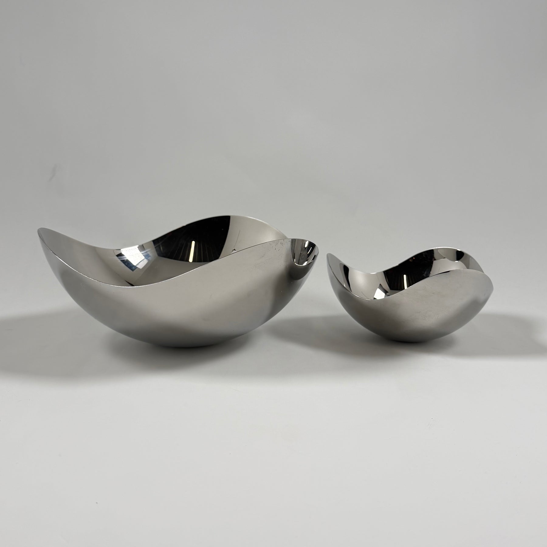 Dessa två skulpturella skålar från det välkända varumärket Georg Jensen kombinerar funktionalitet med estetisk skönhet. Gjorda i högglansigt rostfritt stål, dessa skålar är inte bara vackra att titta på utan också praktiska för en rad olika användningsområden. De är särskilt attraktiva som fruktskålar eller som dekorativa objekt i ett samtida hem. Skålarna är begagnade men har behållit sin spegelliknande lyster och är i mycket gott skick.Produktspecifikationer