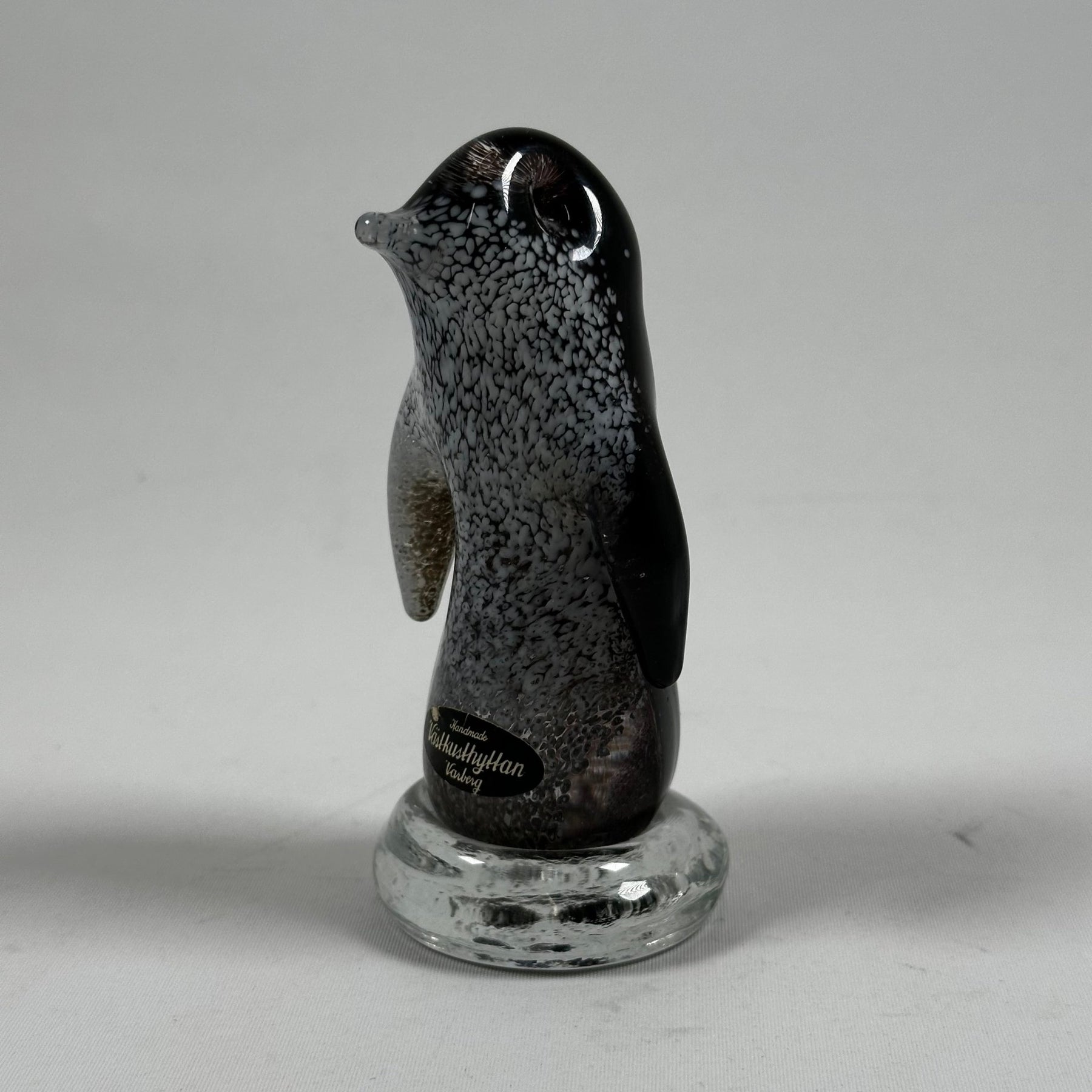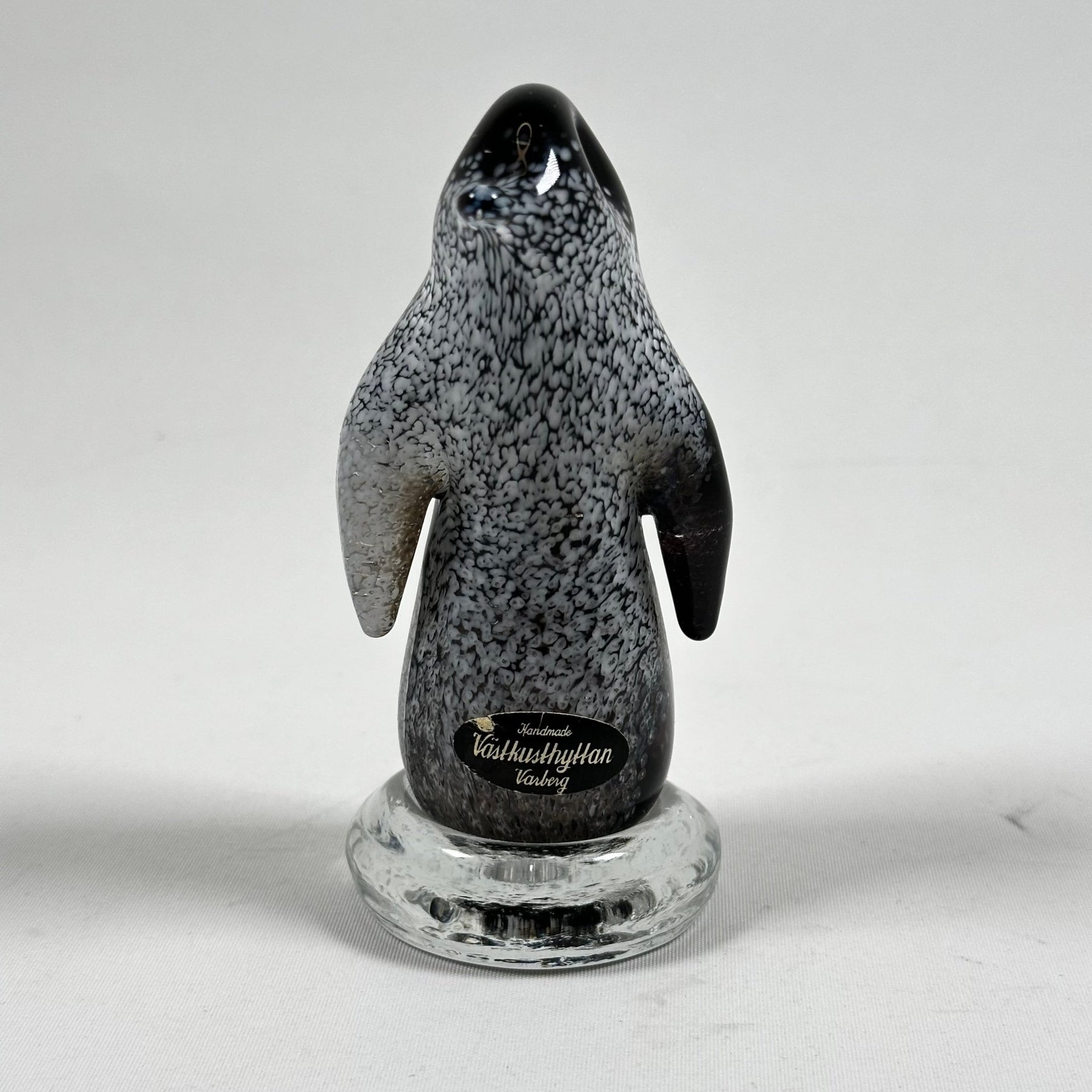 1. Produktinformation Upptäck denna charmiga glasfigur av en pingvin från Varbergs Glashytta, en riktig pärla för samlare! 2. Produktbeskrivning Denna dekorativa pingvin är handgjord i glas med en detaljrik och kornig textur som påminner om en stjärnklar himmel. Tillverkad av Varbergs Glashytta, erbjuder den en unik touch till varje inredning. Den är inte bara ett underbart samlarobjekt utan också ett ståtligt konstverk i ditt hem. Figuren är i utmärkt skick och vilar på en genomskinlig glasbas som ger en illusion av is. 3. Produktspecifikationer
