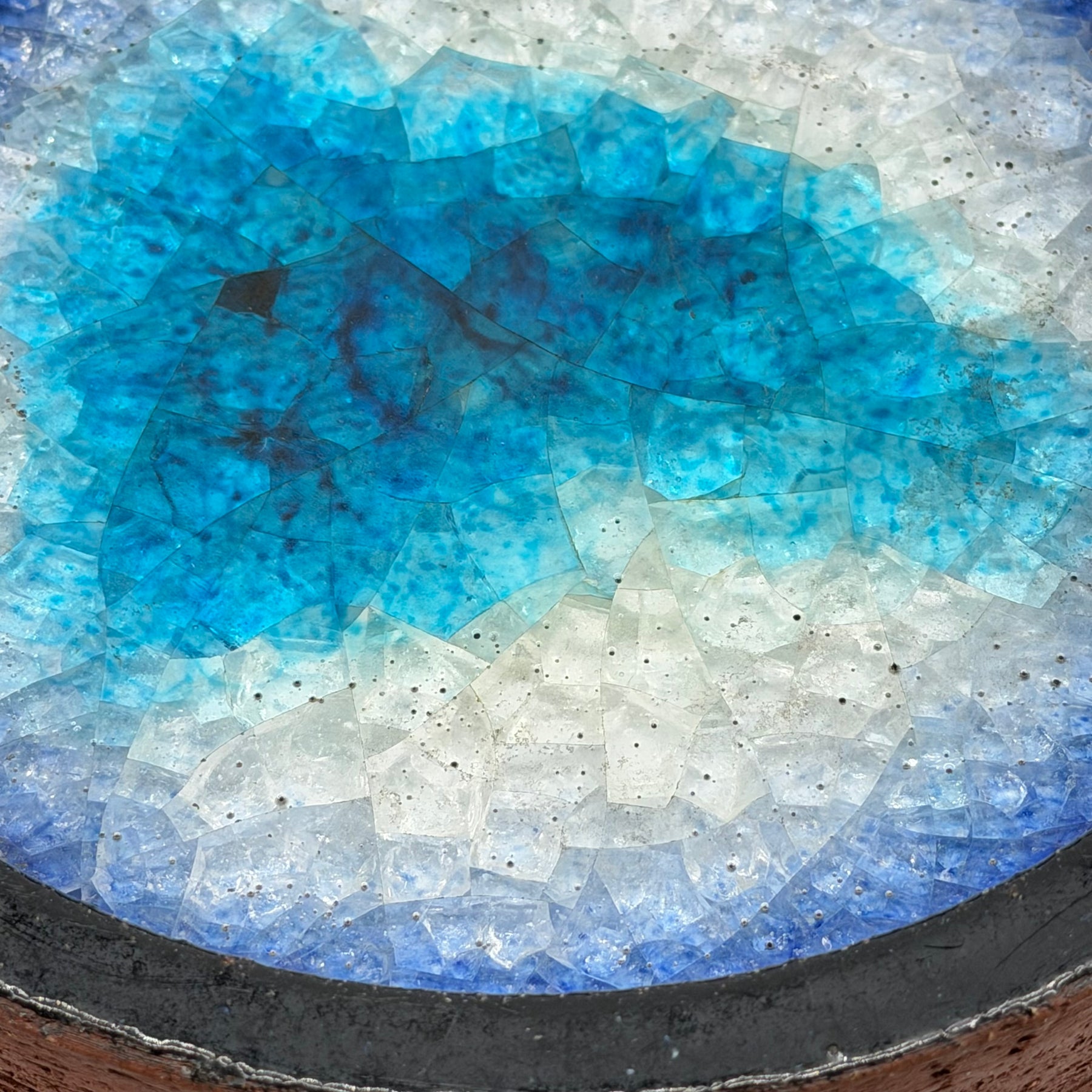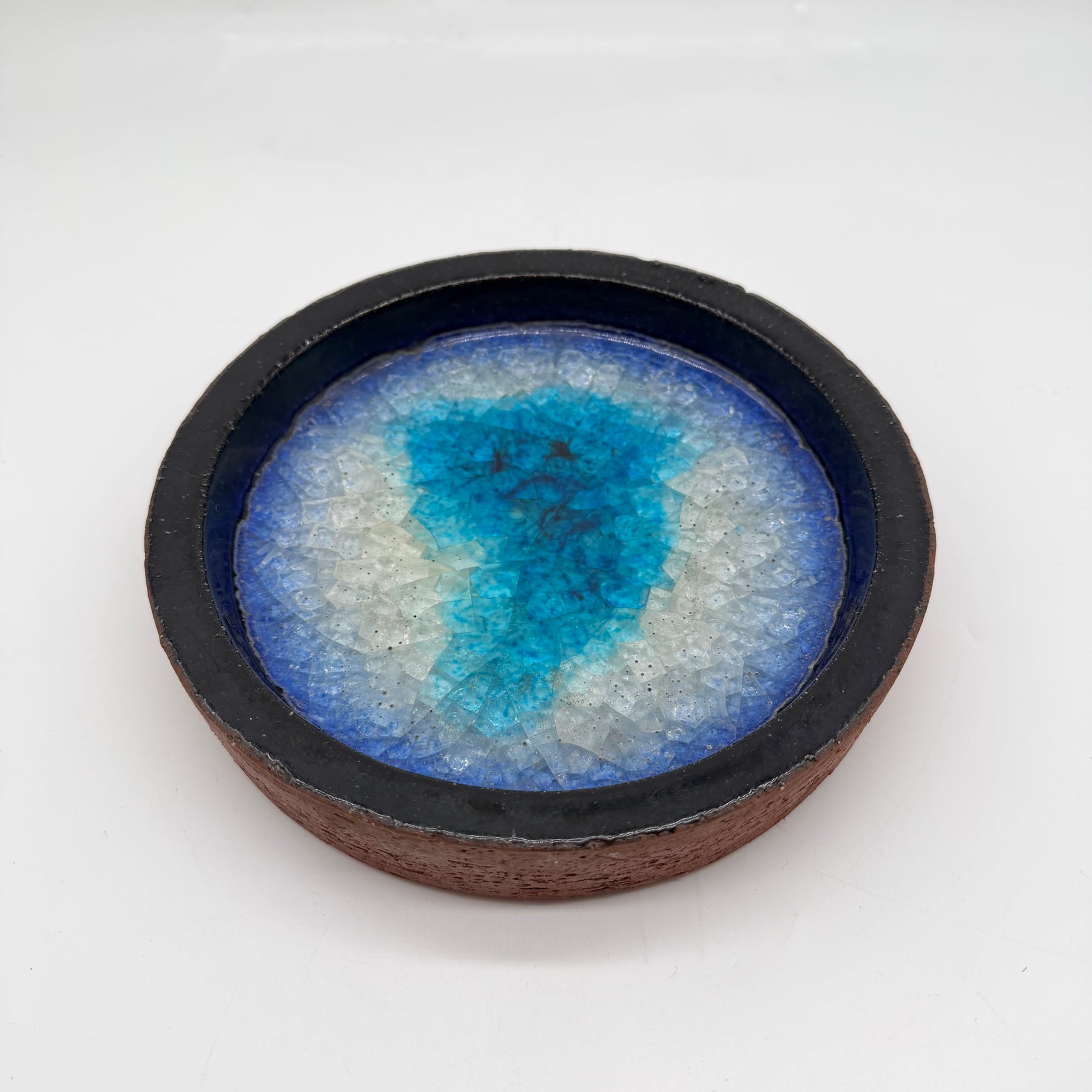 Denna charmiga skål är tillverkad av keramik med en fängslande mosaik av kristaller i nyanser av blått och grönt, inneslutna i en svart kant. Designen är både dekorativ och praktisk, vilket gör den till ett perfekt blickfång i varje rum. Skålen är skapad av konstnären ‘Naomi’, vars signatur finner du på baksidan. Den här skålen är inte bara ett konstverk utan även ett minnesvärt inslag i inredningen.