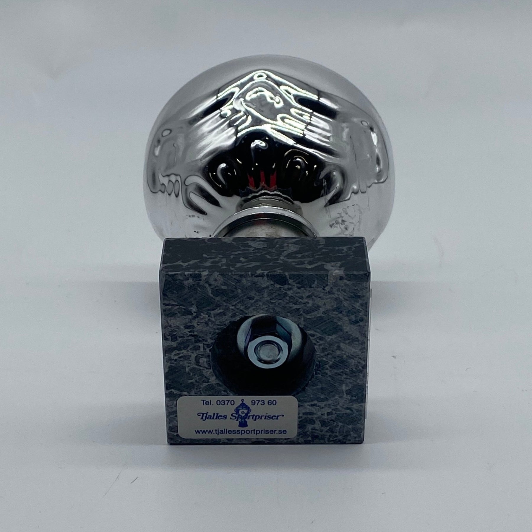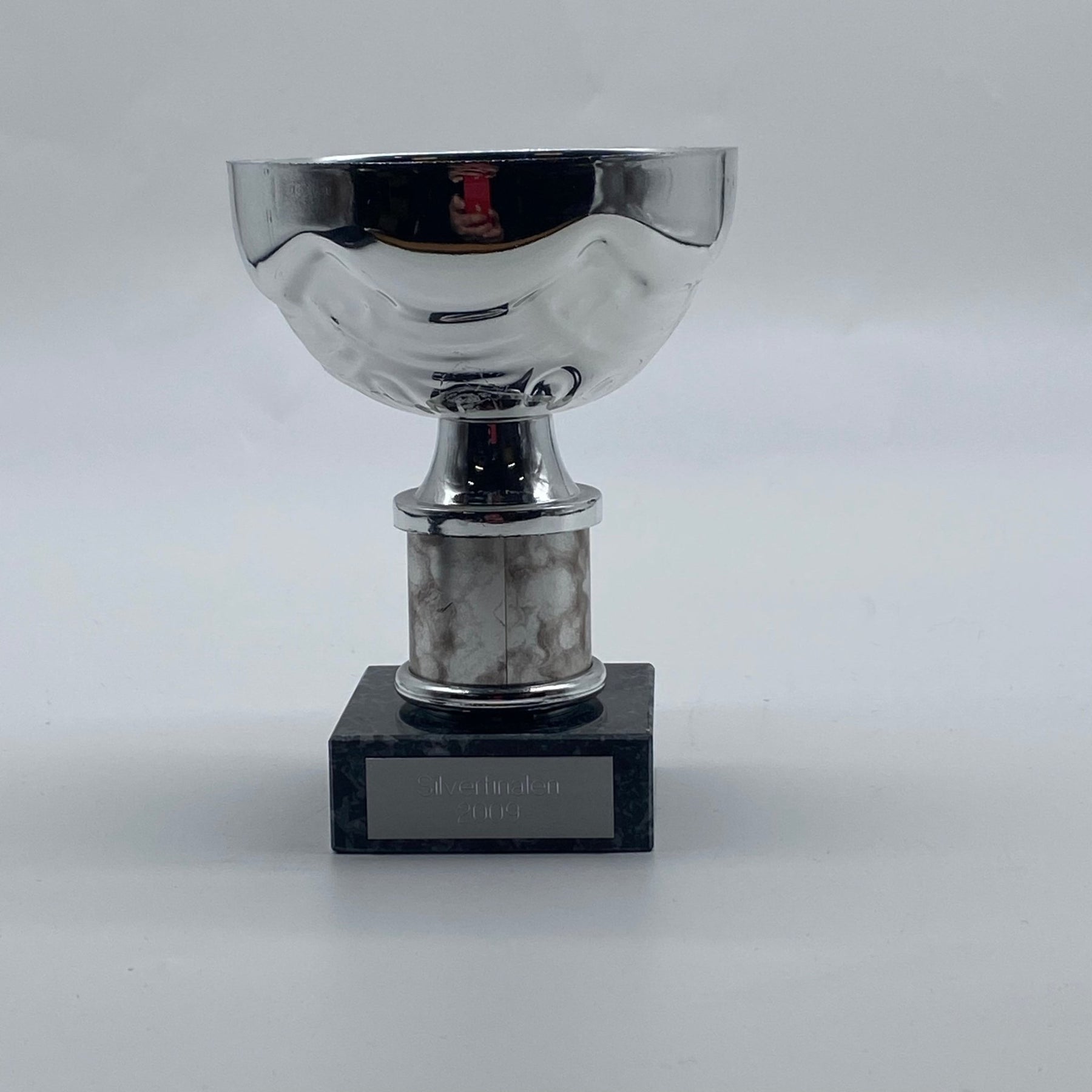 Denna dekorativa pokal är perfekt som prydnad eller minnesföremål. Tillverkad med en silverfinish och en bas av marmorerad sten, denna pjäs framhäver skönheten i såväl modern som traditionell inredning. Används men bevarad i gott skick, så lätta bruksspår kan förekomma.
