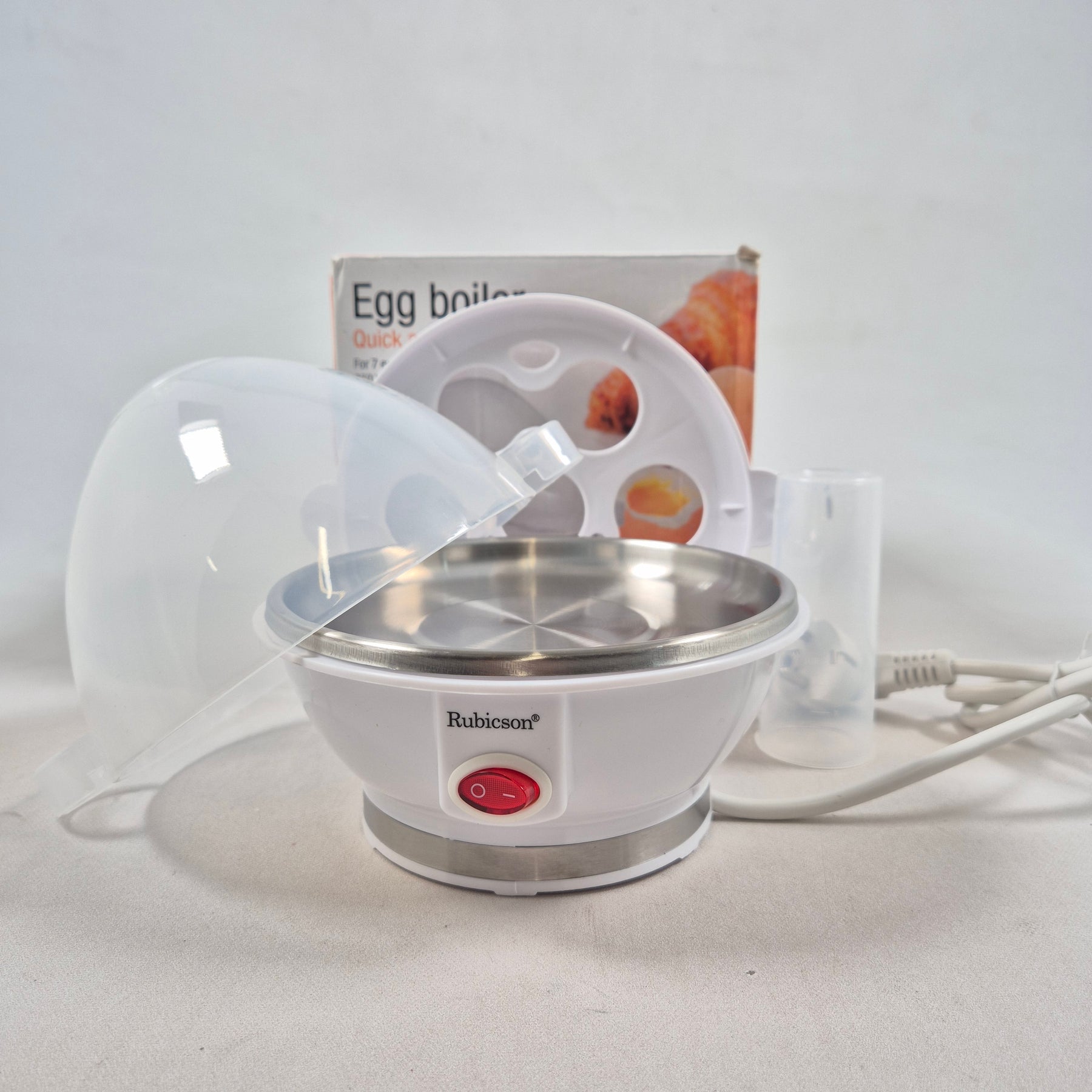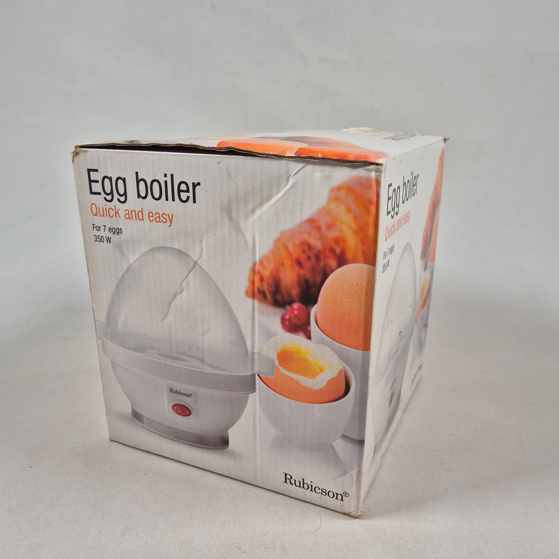 Denna äggkokare kan snabbt koka upp till sju ägg åt gången, vilket gör den perfekt för både större och mindre hushåll. Med en praktisk måttbägare garanteras perfekt konsistens varje gång. Äggkokaren stängs av automatiskt när äggen är klara, vilket gör den både säker och energieffektiv. Den är begagnad men i mycket gott skick, redo att tjäna sitt nästa hem.Produktspecifikationer