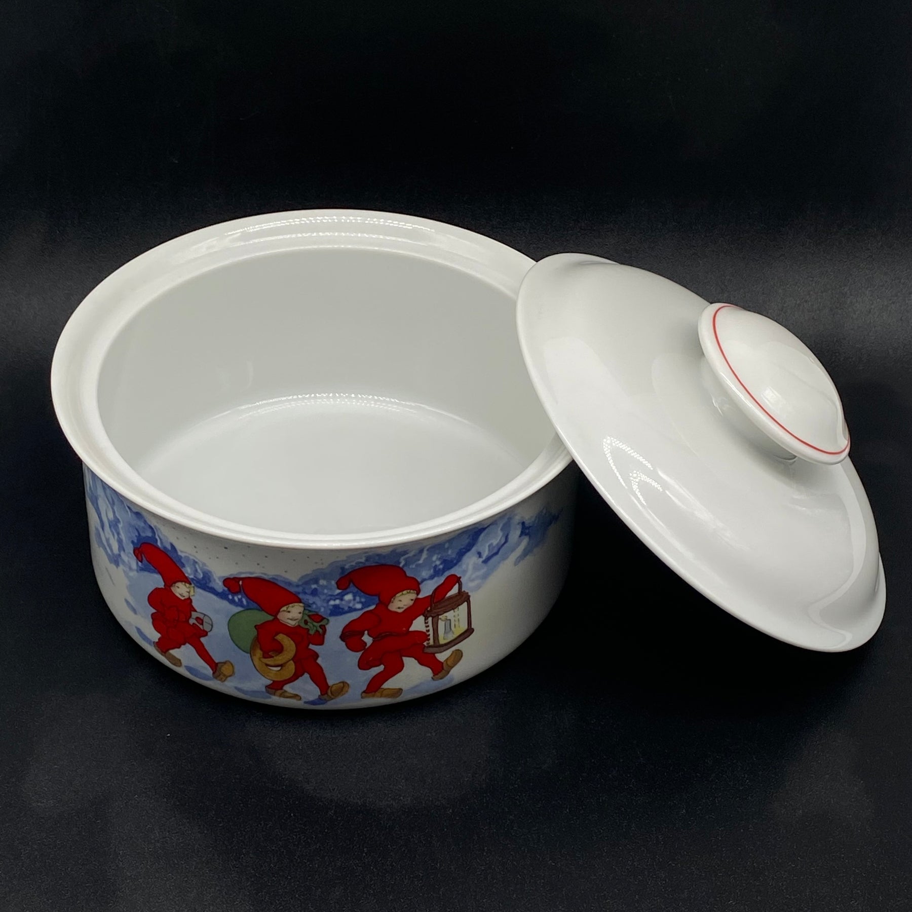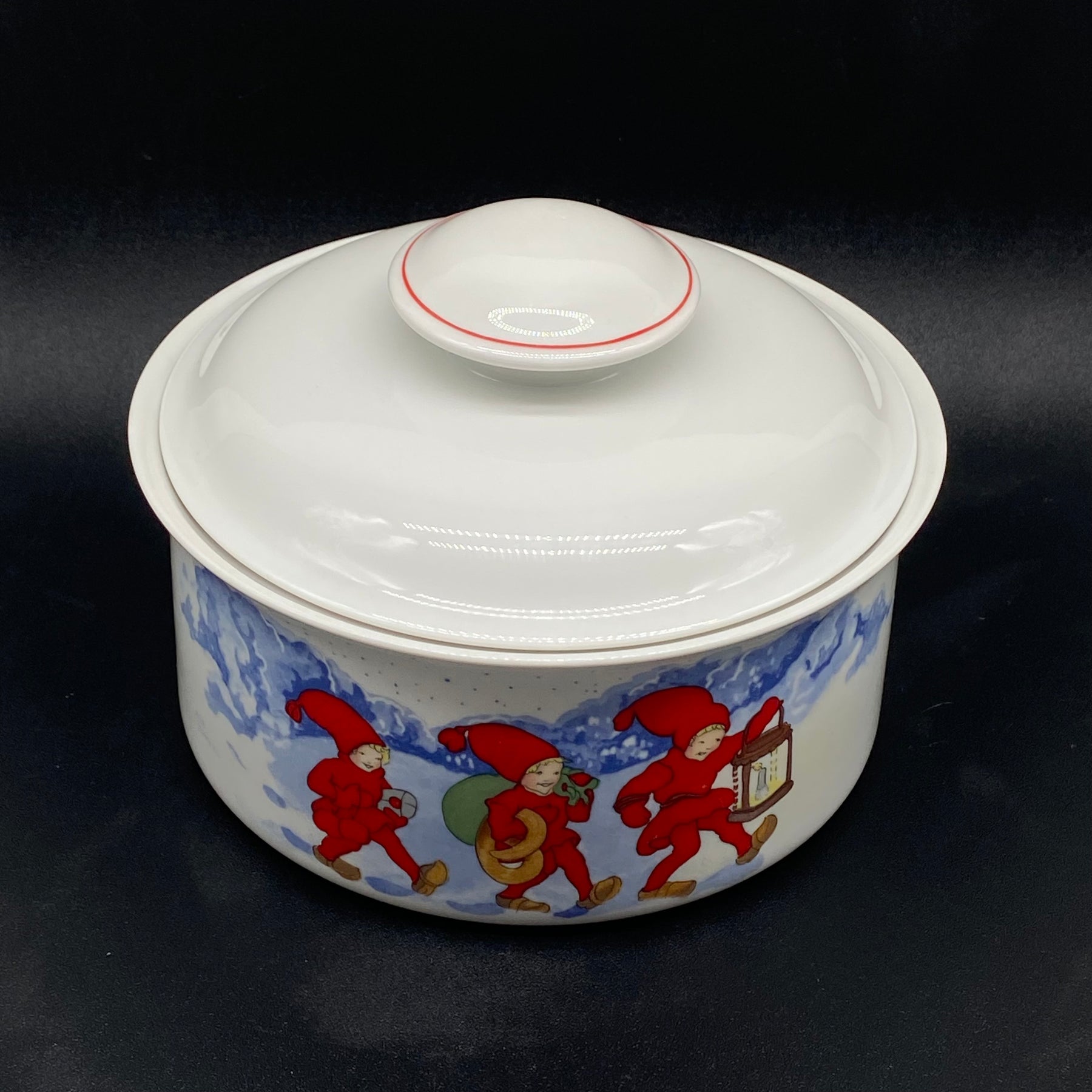 Denna säsongsbetonade våffeljärnsgryta bär Aina Stenbergs signaturdesign, med livliga tomtemotiv som skapar en perfekt julstämning. Grytan är tillverkad av högkvalitativt porslin och är inte bara till för att servera utan också en utmärkt samlarobjekt, speciellt under högtider. Tillståndet är begagnat men välbevarat, vilket gör den till ett utmärkt tillskott i varje hem eller som en uppskattad gåva.
