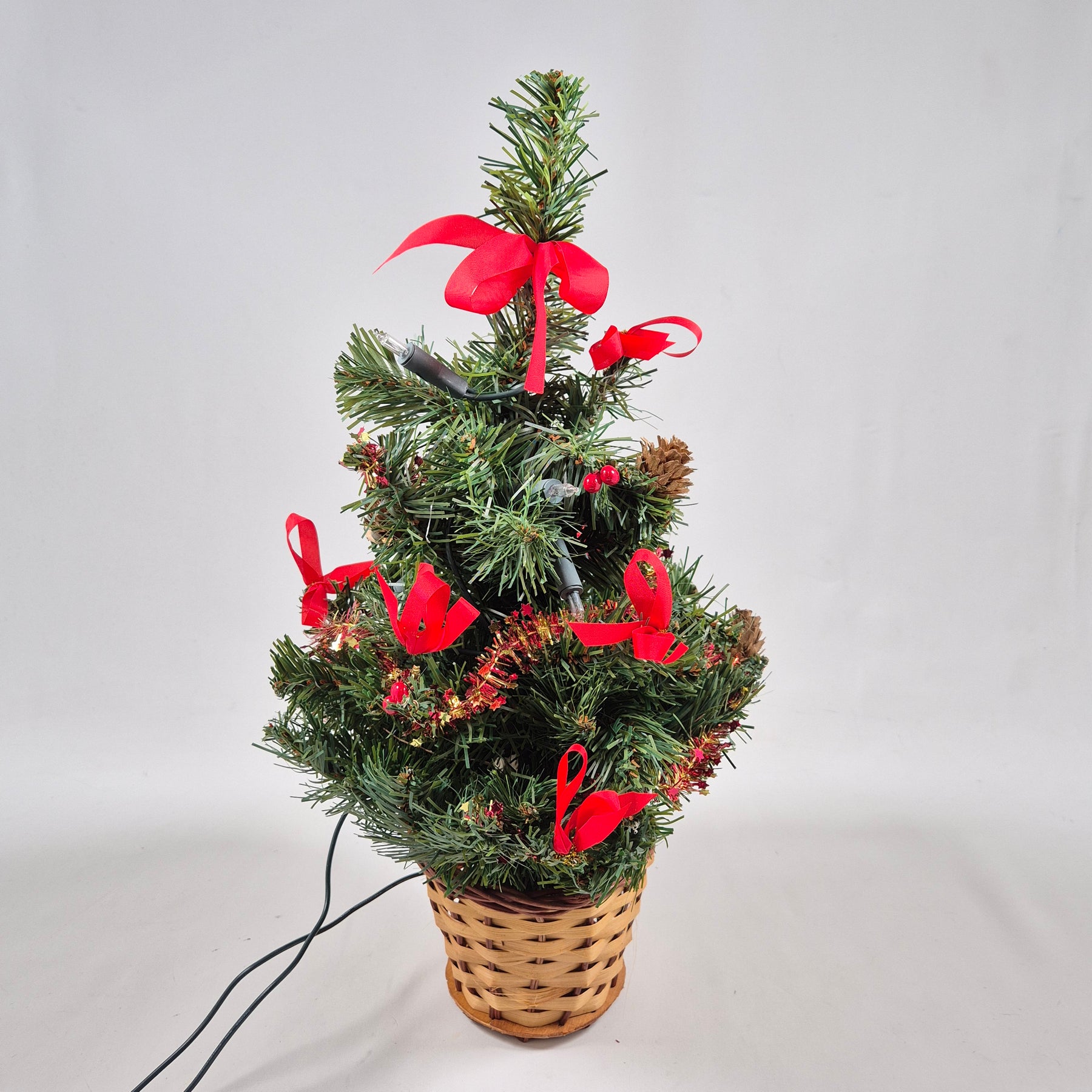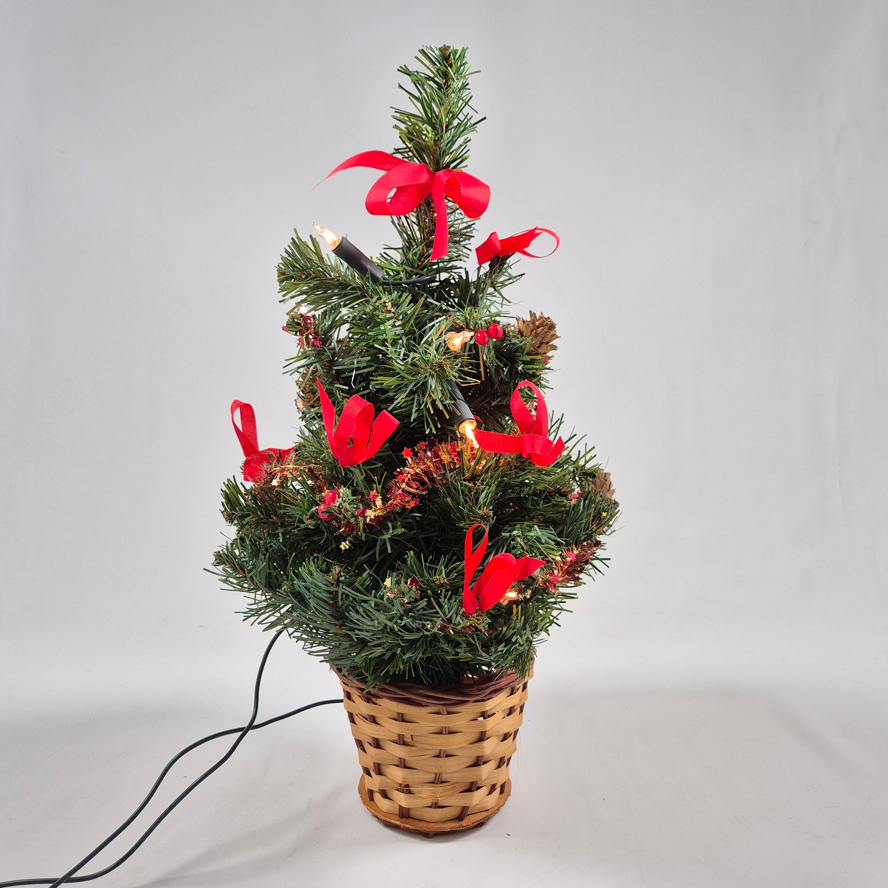 Förgyll julstämningen med en charmig och dekorativ julgran i kruka, komplett med festliga röda rosetter och belysning.