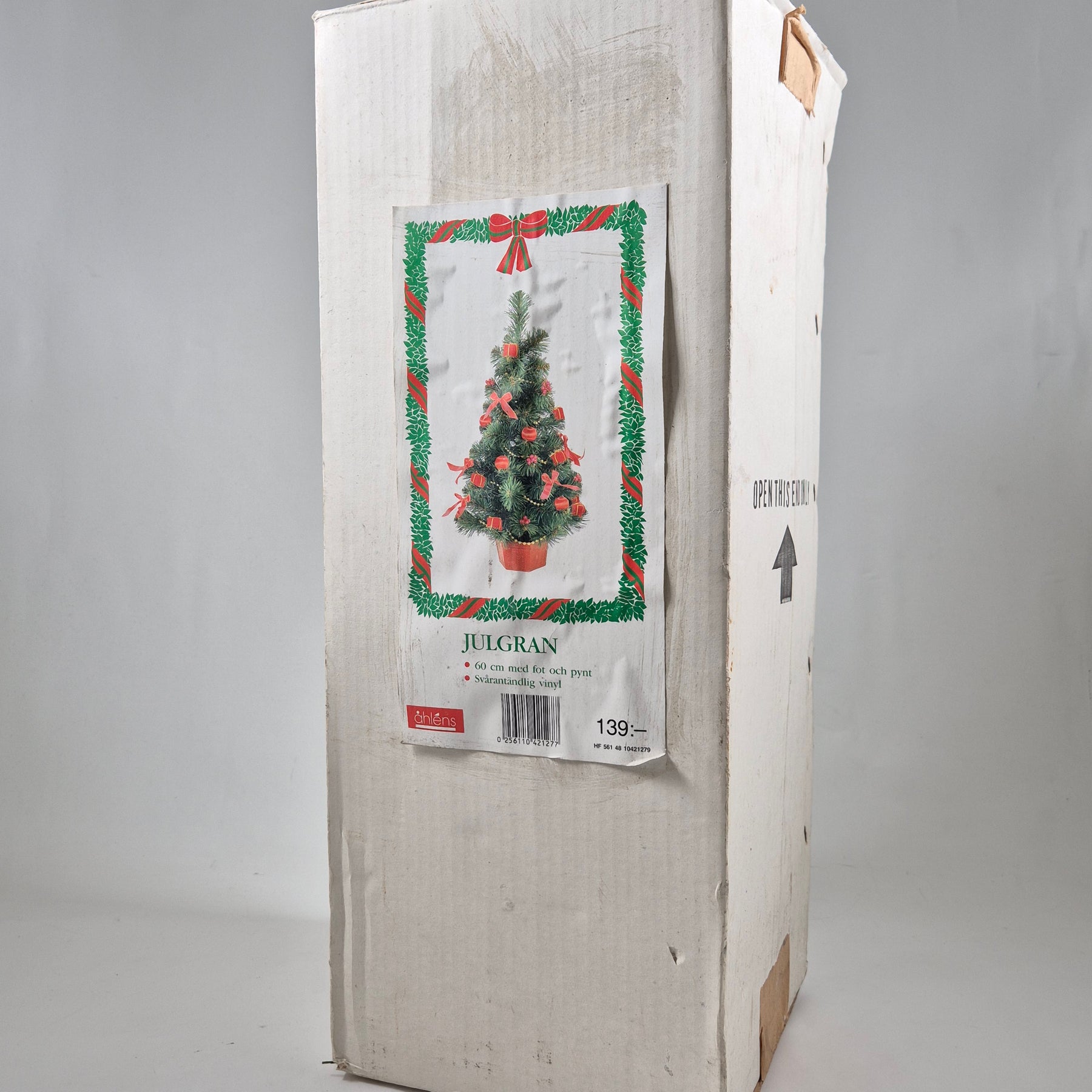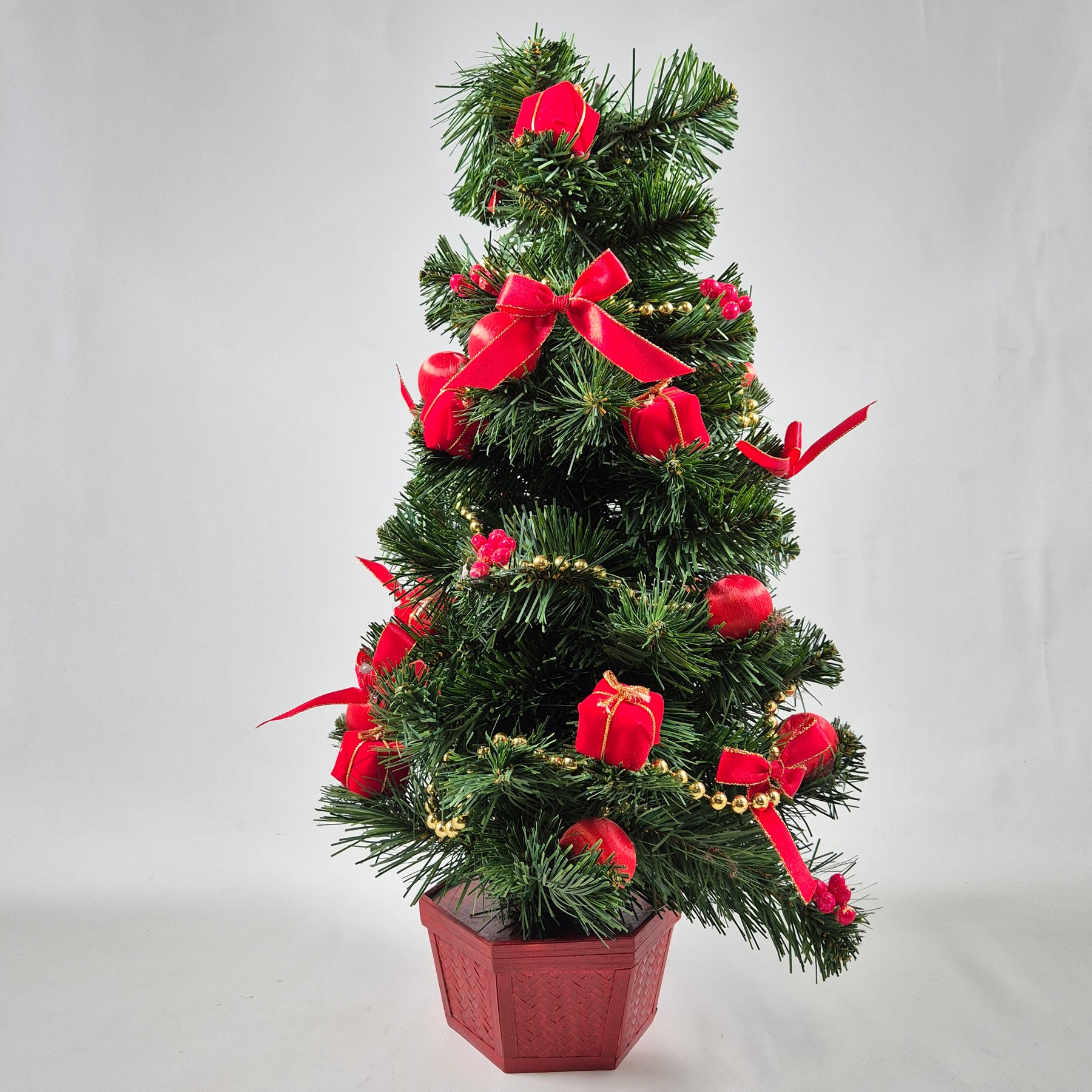 Denna vackra konstgjorda julgran är 60 cm hög och redan färdigpyntad med röda rosetter, kulor och små presentförpackningar. Perfekt för kontoret eller som ett platsbesparande alternativ i hemmet. Granen är återanvändbar år efter år och gör att du kan njuta av julstämningen utan att behöva köpa en ny varje säsong. Produkten är begagnad men i mycket gott skick och finns i sin originalförpackning.