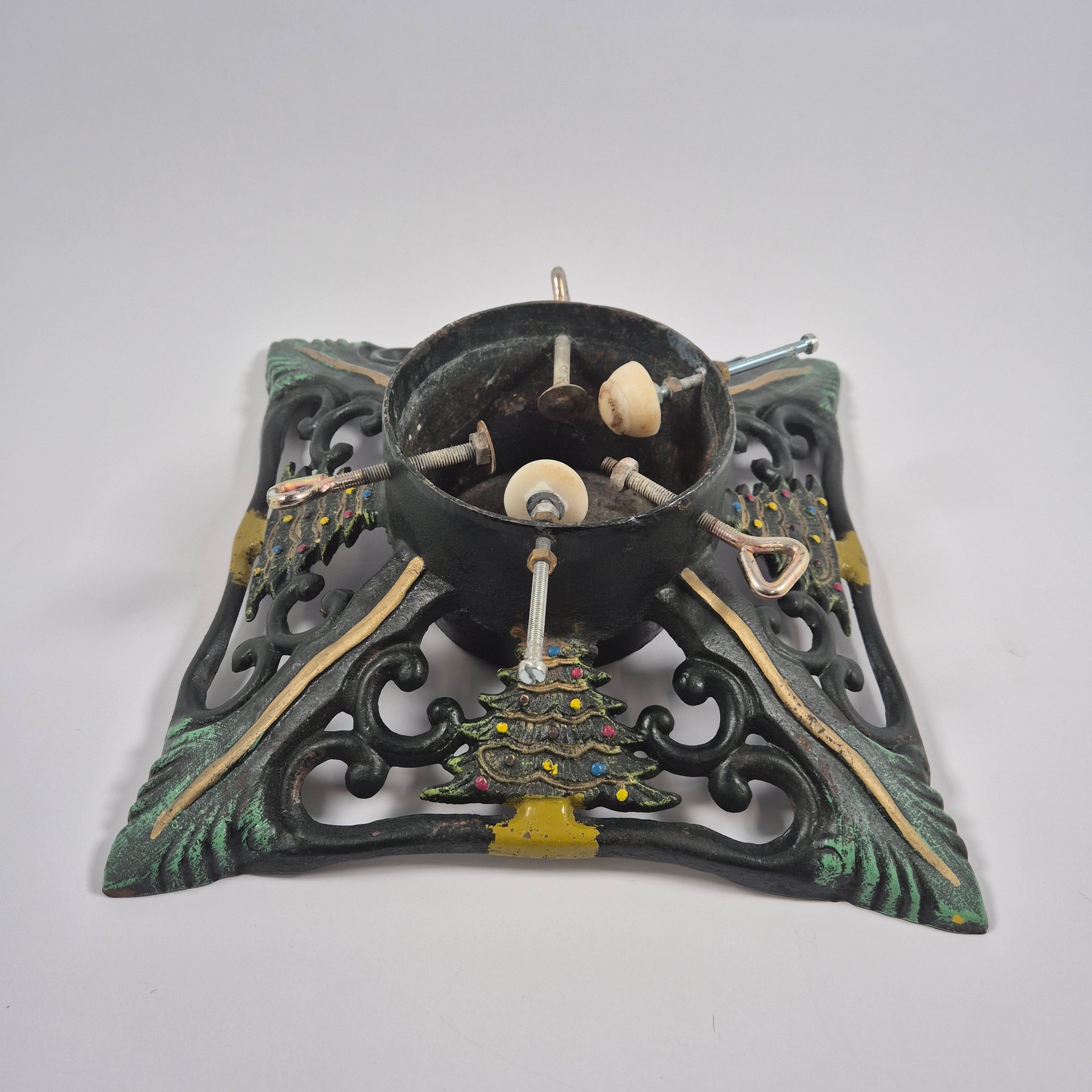 Stabil julgransfot i målat gjutjärn med dekorativa julgranar och färgglada detaljer som ger ett traditionellt uttryck. Fästskruvar runt hållaren gör att granen står rakt och säkert, perfekt för dig som vill kombinera funktion med nostalgisk julstämning. Begagnad med synliga bruksspår och viss färgslitage, men i överlag gott och fullt funktionsdugligt skick. Levereras i originalkartong med tydliga tecken på ålder och hantering.3. Produktspecifikationer