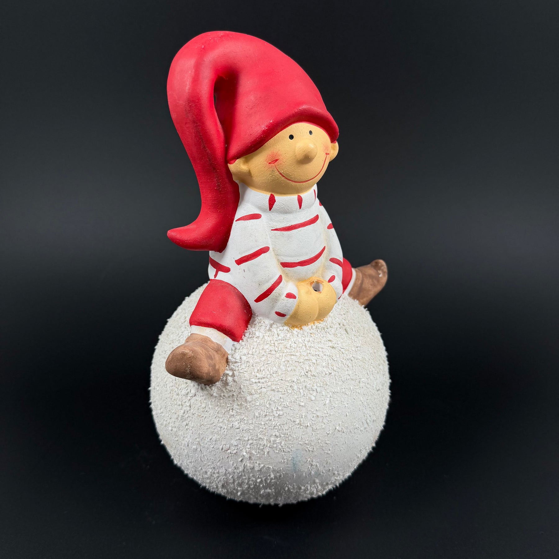 Denna söta julfigur föreställer en nalle klädd i en röd och vit randig pyjamas med matchande tomteluva, vilandes på en vit snöboll. Figuren är tillverkad av Hedlundgruppen AB, känd för kvalitativa och detaljrika juldekorationer. Med sitt leende och glada uttryck blir denna dekoration en älskvärd detalj i varje rum. Figuren är begagnad men i mycket gott skick, perfekt för att förgylla säsongens fester.